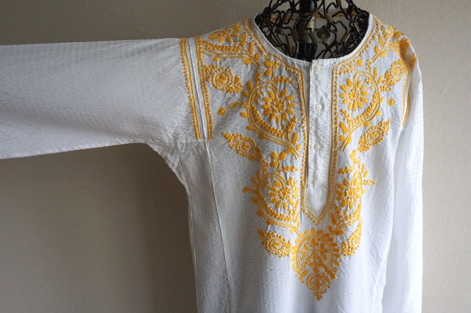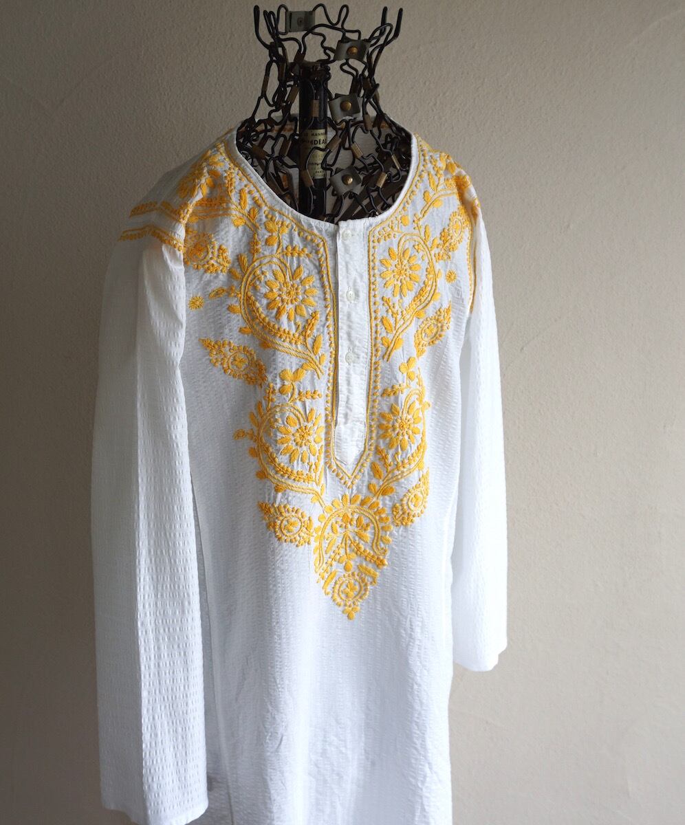 1990’s〜 エンブロイダリー ロングチュニック シアサッカー ホワイト×イエロー 実寸(women's S程度) 刺繍