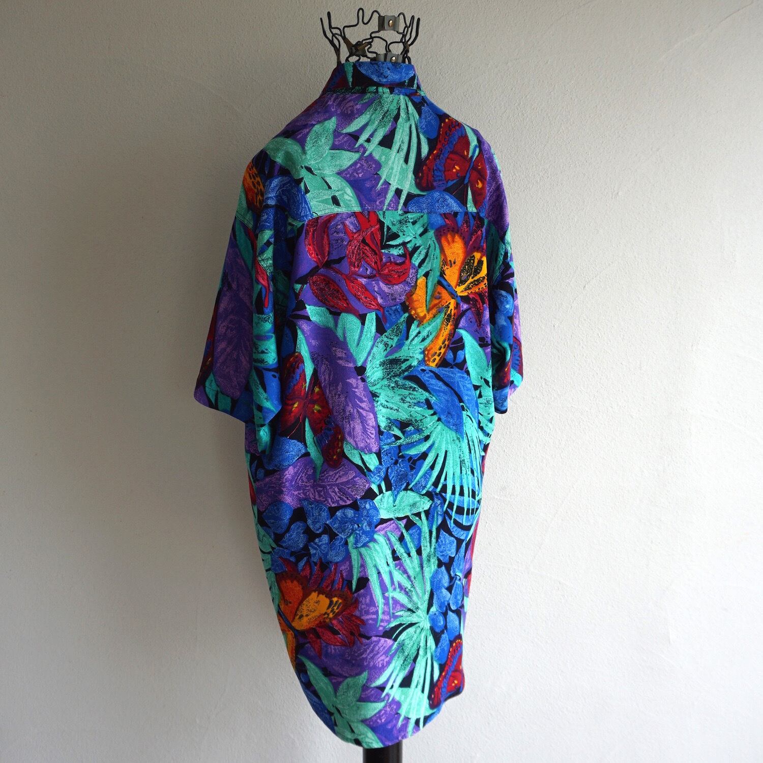 80’sらしいカラーリングのボタニカル柄が目を惹く、S/Sレーヨンシャツ。