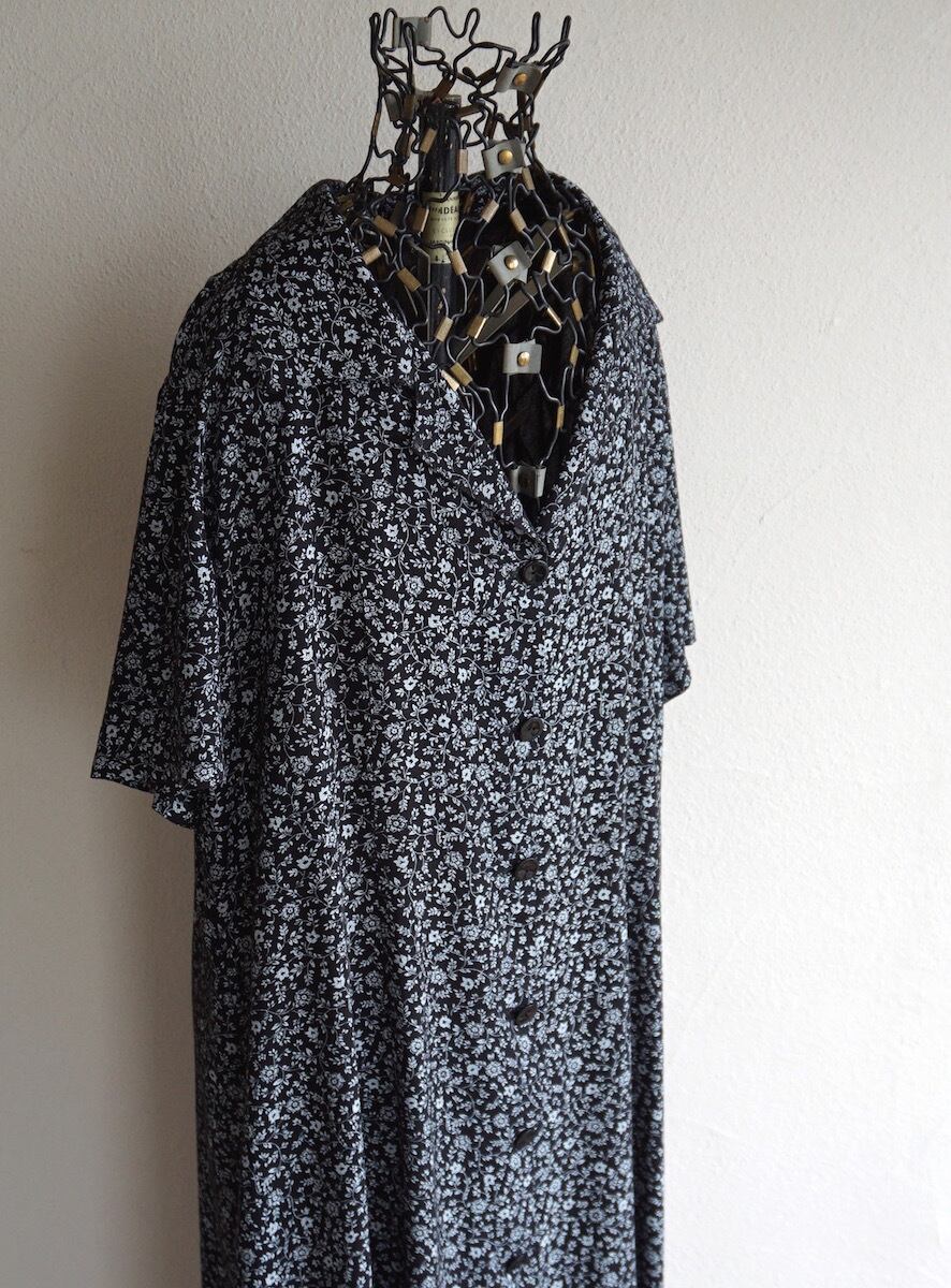 1990’s モノトーンフローラル柄 S/S ロングドレス ブラック×ホワイト 実寸(women's M程度) 花柄 ヴィンテージ