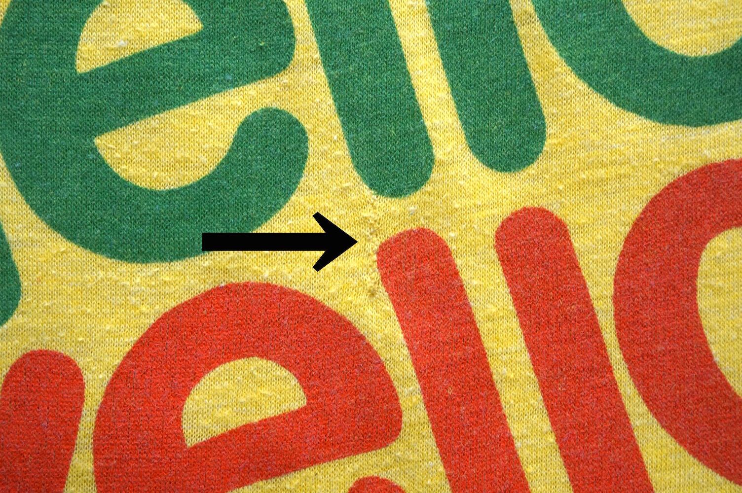 柔らかいイエローのボディにポップなロゴが当時らしい、プリントTシャツ。