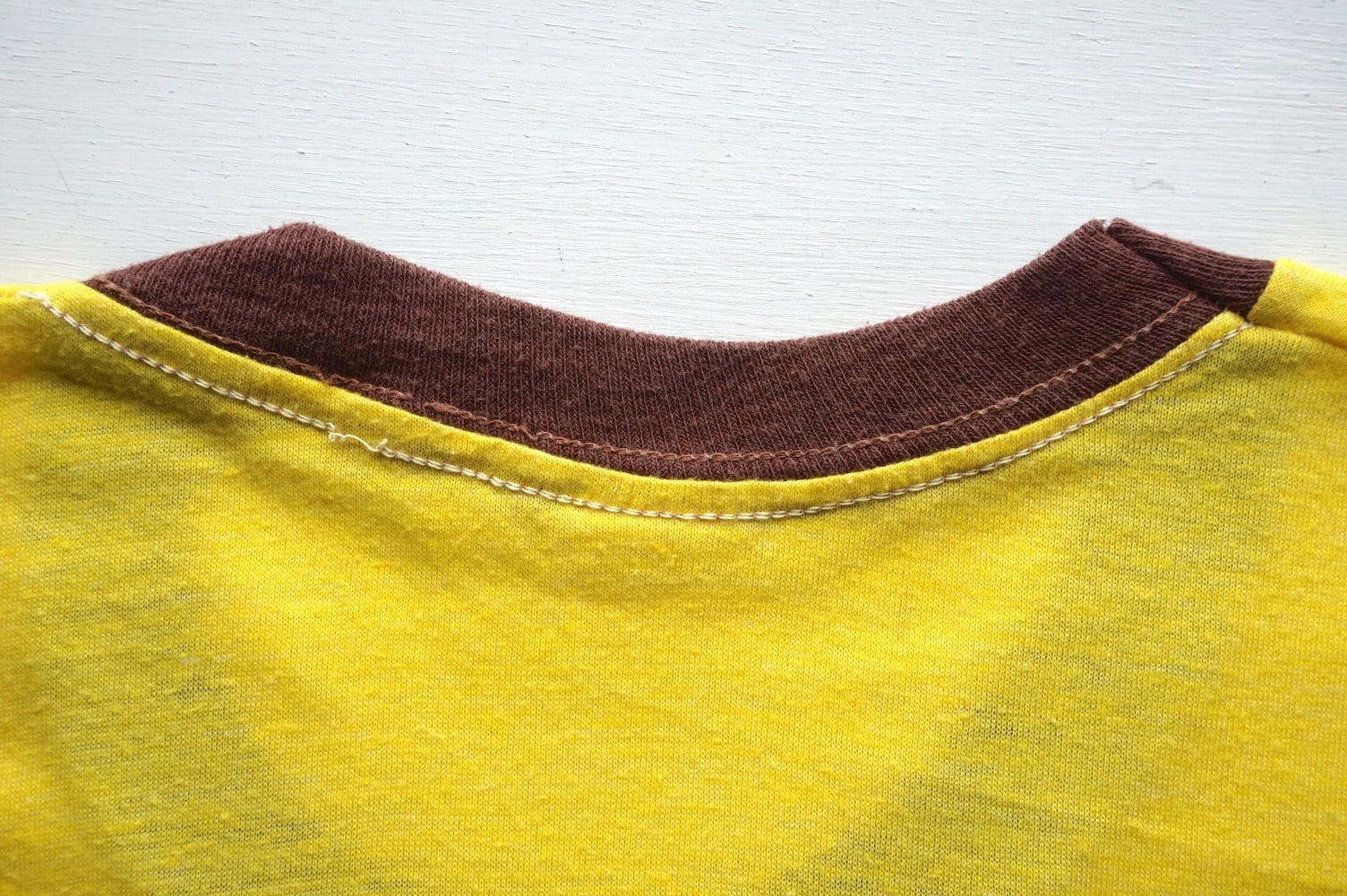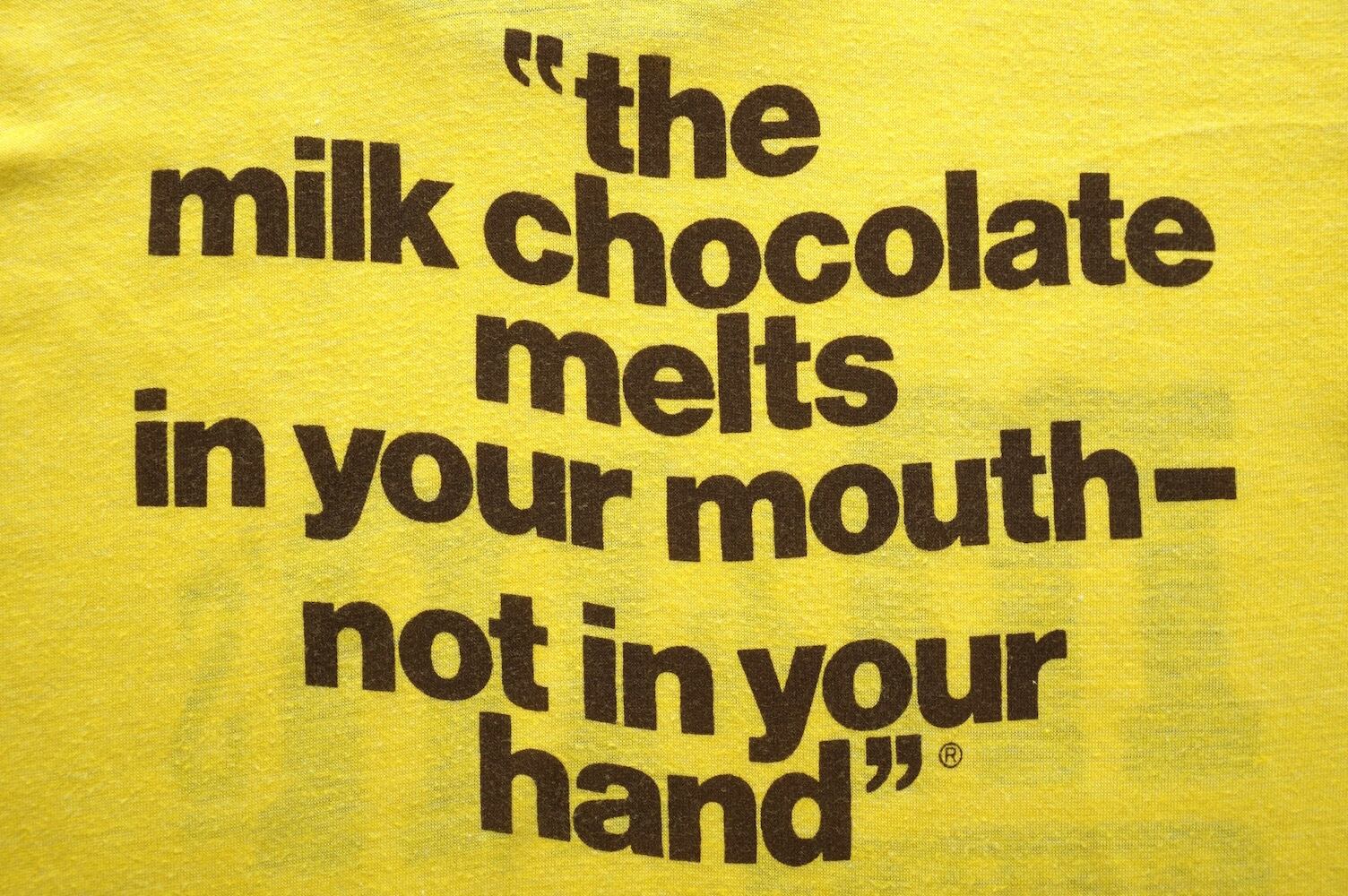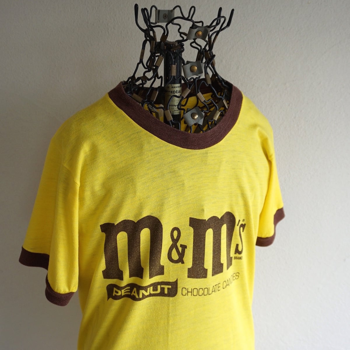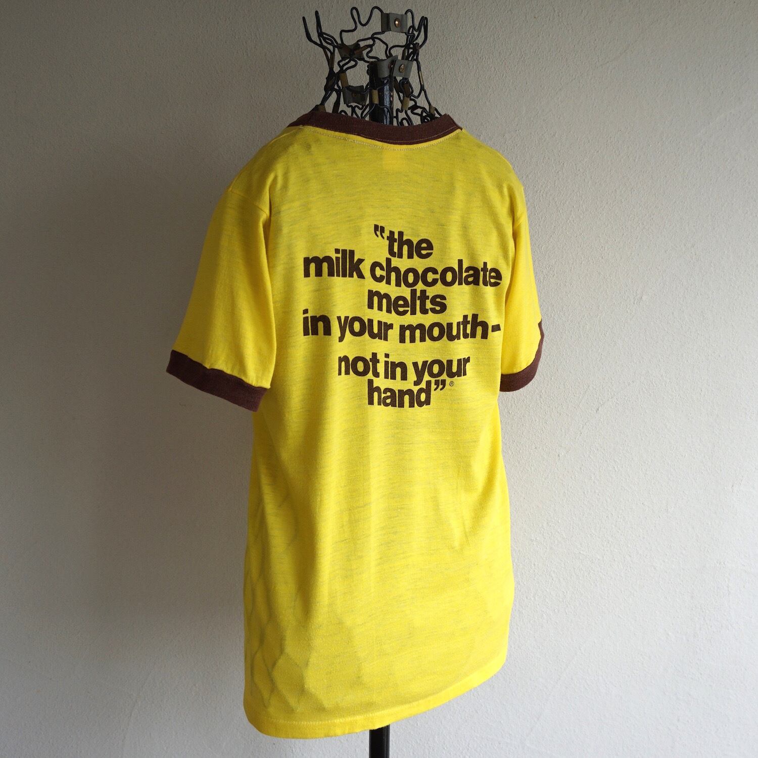 1970’s "m&m's" 両面ウォータープリント リンガーTシャツ イエロー×チョコレートブラウン 実寸(XS〜S程度) エムアンドエムズ ヴィンテージ