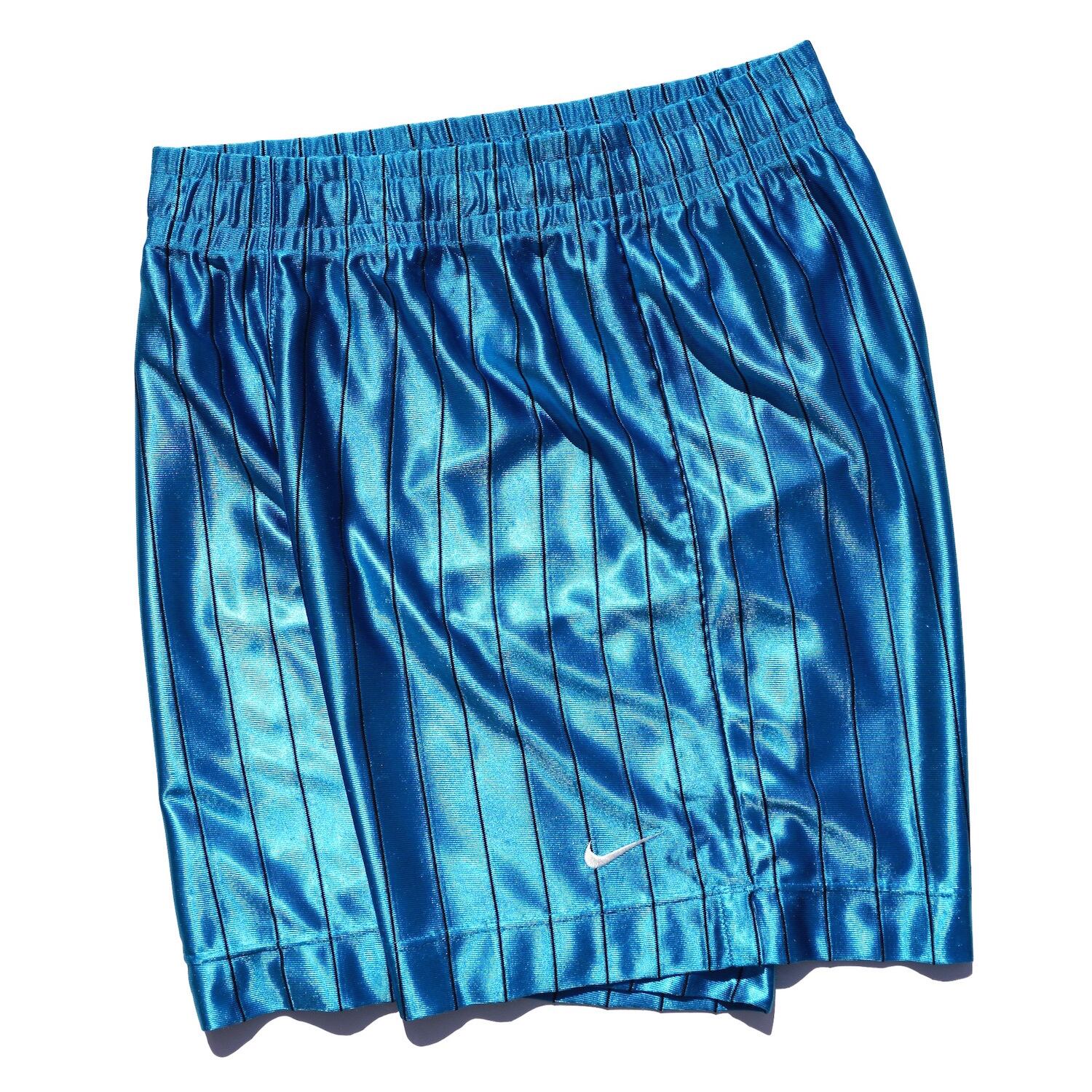 1990’s USA製 [NIKE] トレーニングショーツ ワンポイントSWOOSH刺繍 ピンストライプ ターコイズブルー×ブラック 表記(M) ナイキ ヴィンテージ