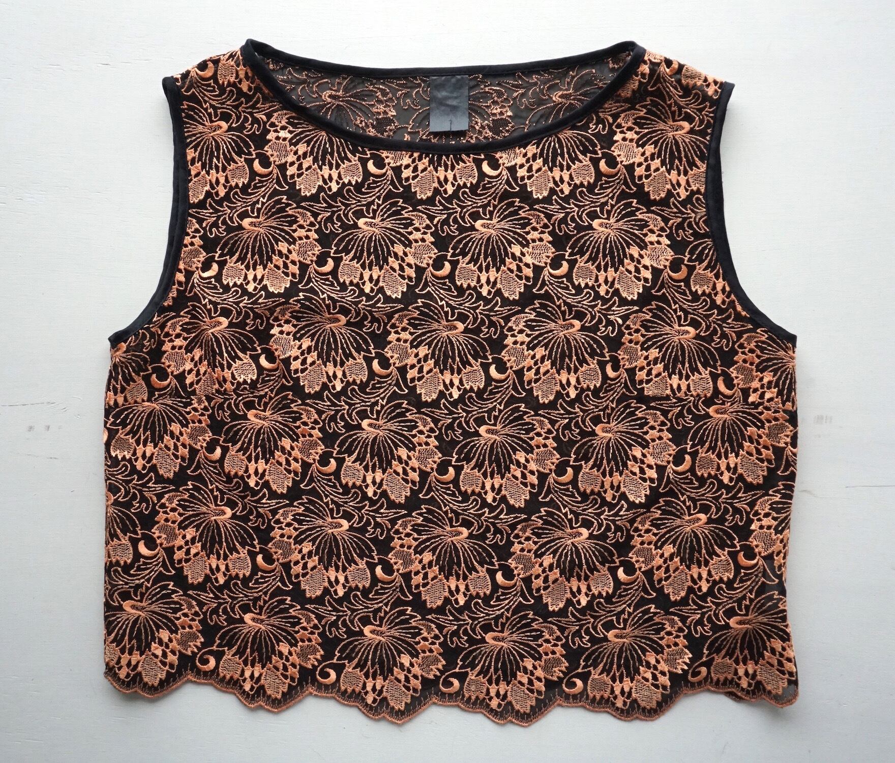 1980’s [vezenine bled] エンブロイダリーレース スリーブレスカットソー ブラック×アプリコット 実寸(women's S程度) ユーロ ヨーロッパ ヴィンテージ