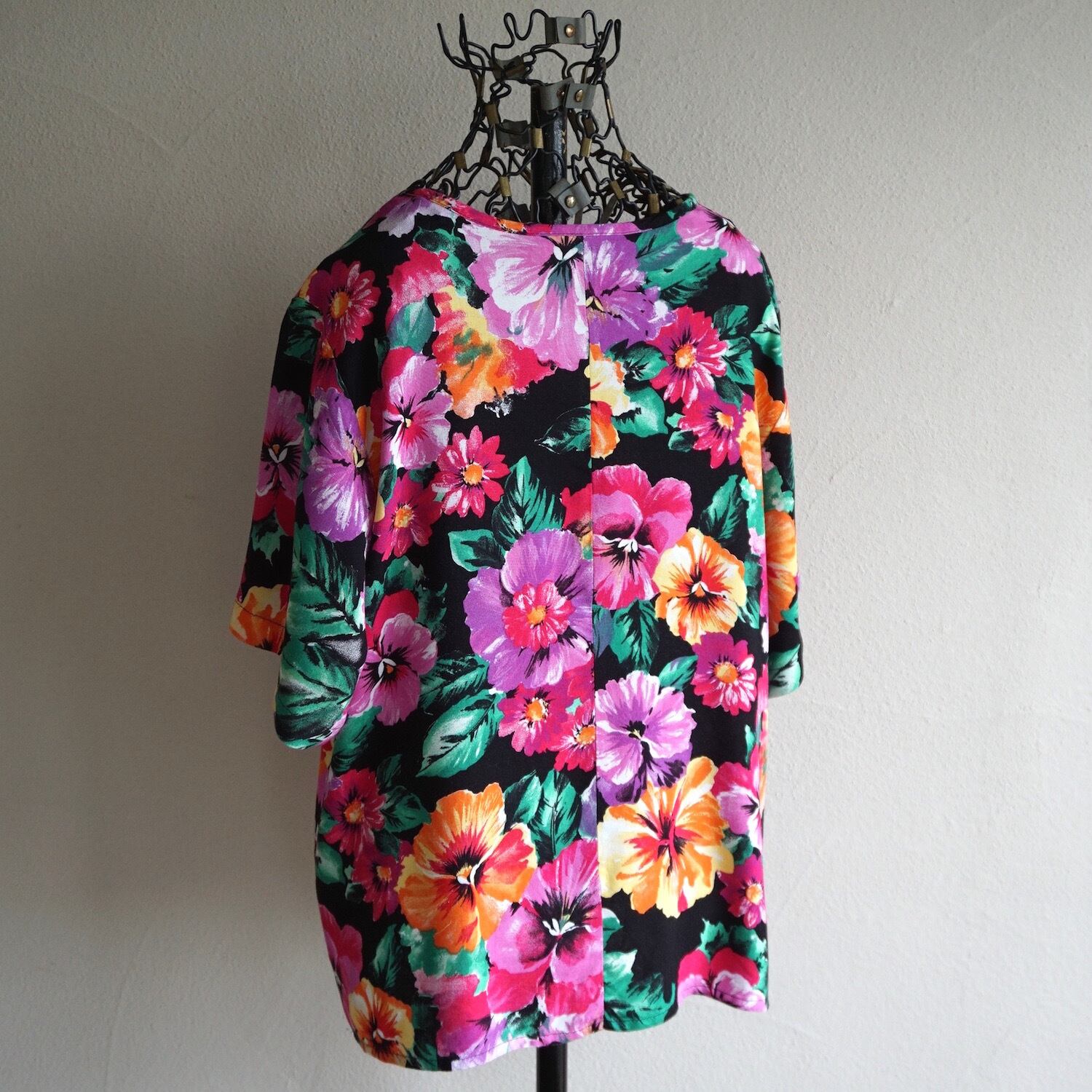 1990’s USA製 [SAG HARBOR] フローラル柄 S/S クルーネックカットソー ブラック×ピンク系 実寸(women's M程度) 花柄 ヴィンテージ