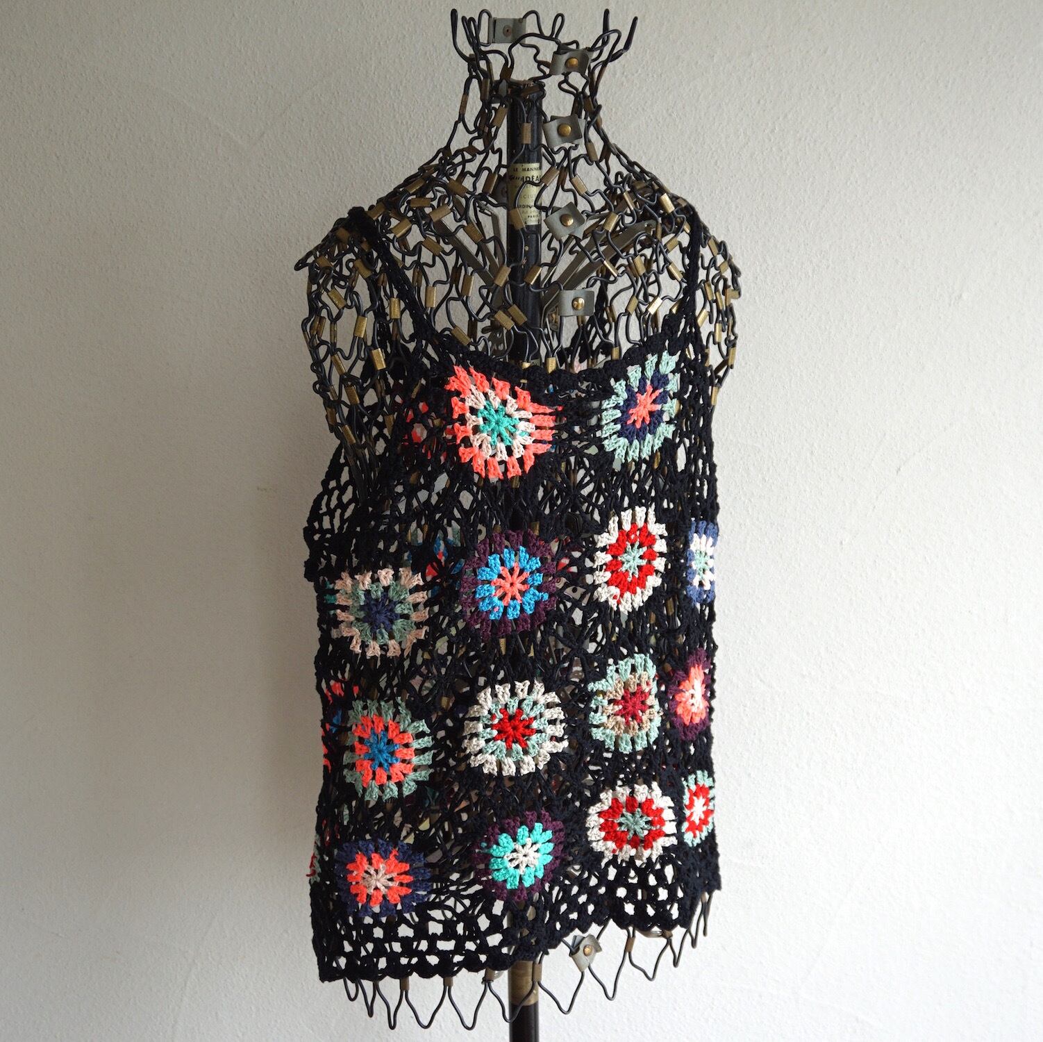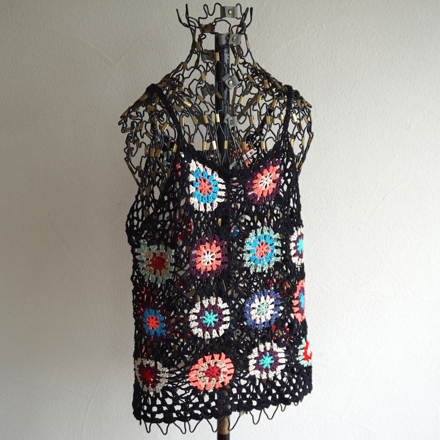 グラニークロシェキャミソール ブラック×マルチ 実寸(women's M程度) レトロ ポップ