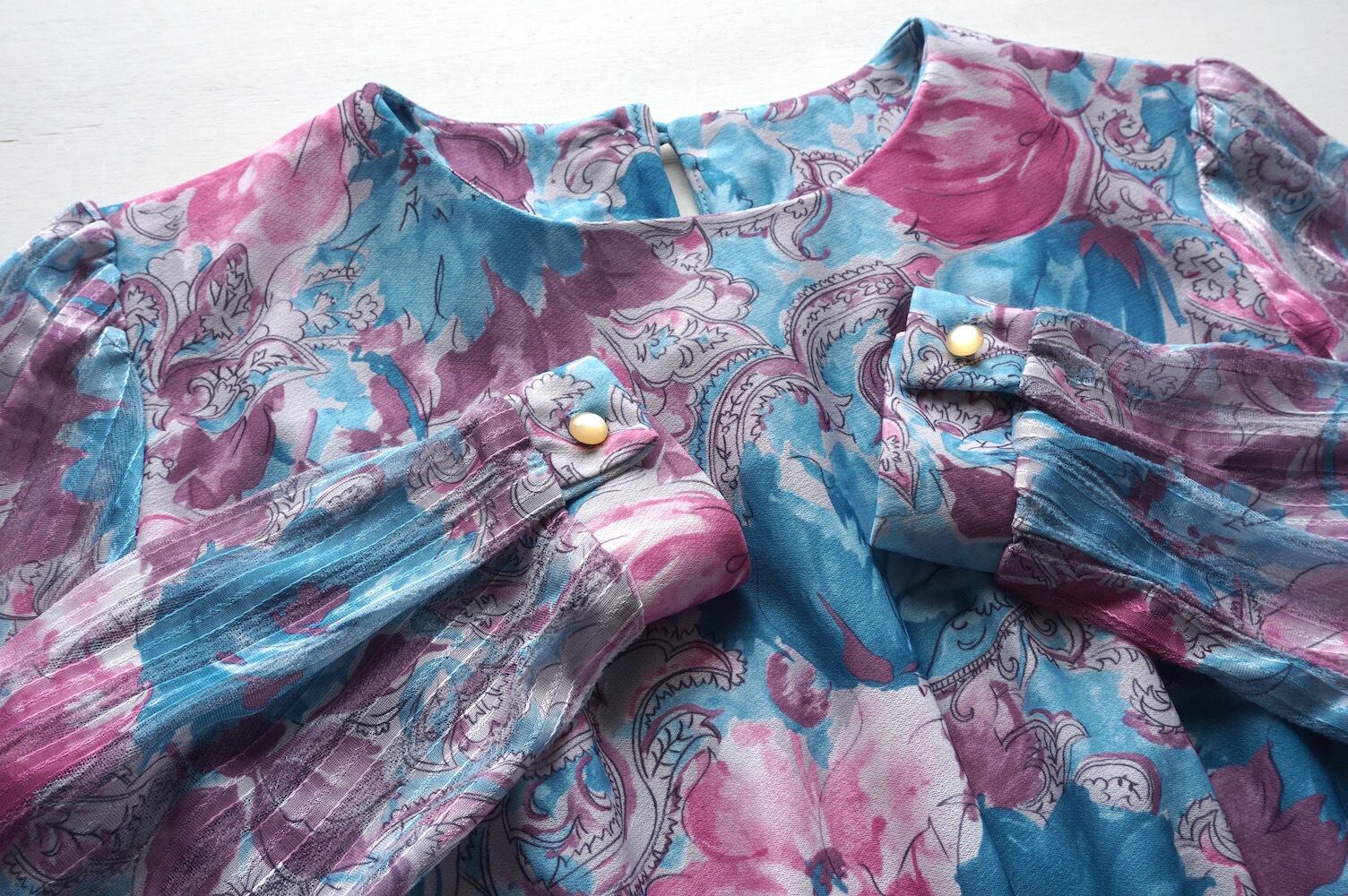 1980’s USA製 [Carriage Court] シアースリーブ フローラル柄 ロングドレス ペールトーン 実寸(women's L程度) シースルー ワンピース ヴィンテージ