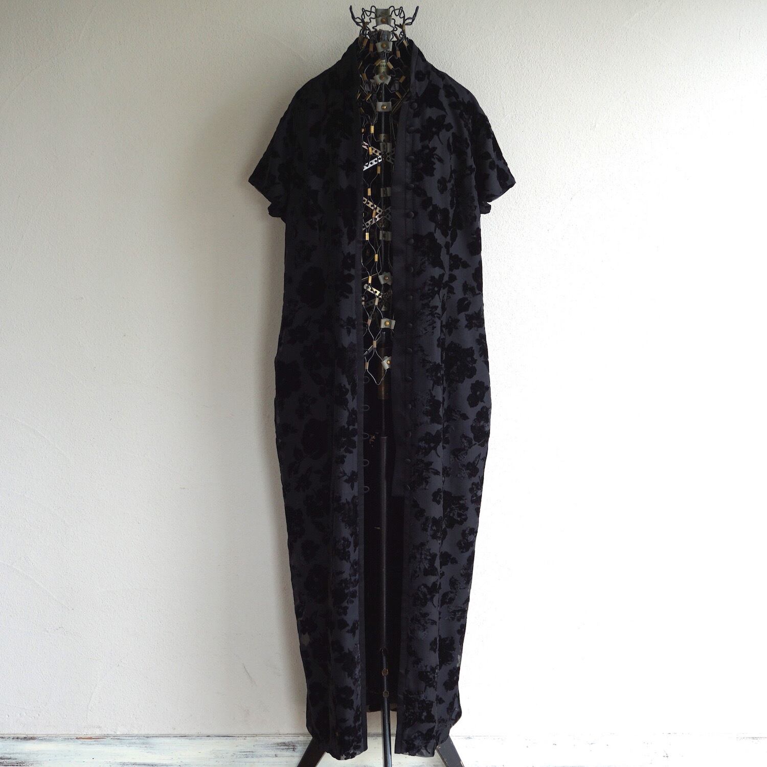 フローラル柄のバーンアウト(透かし模様加工)が美しい、チャイナドレス調S/Sロングドレス。