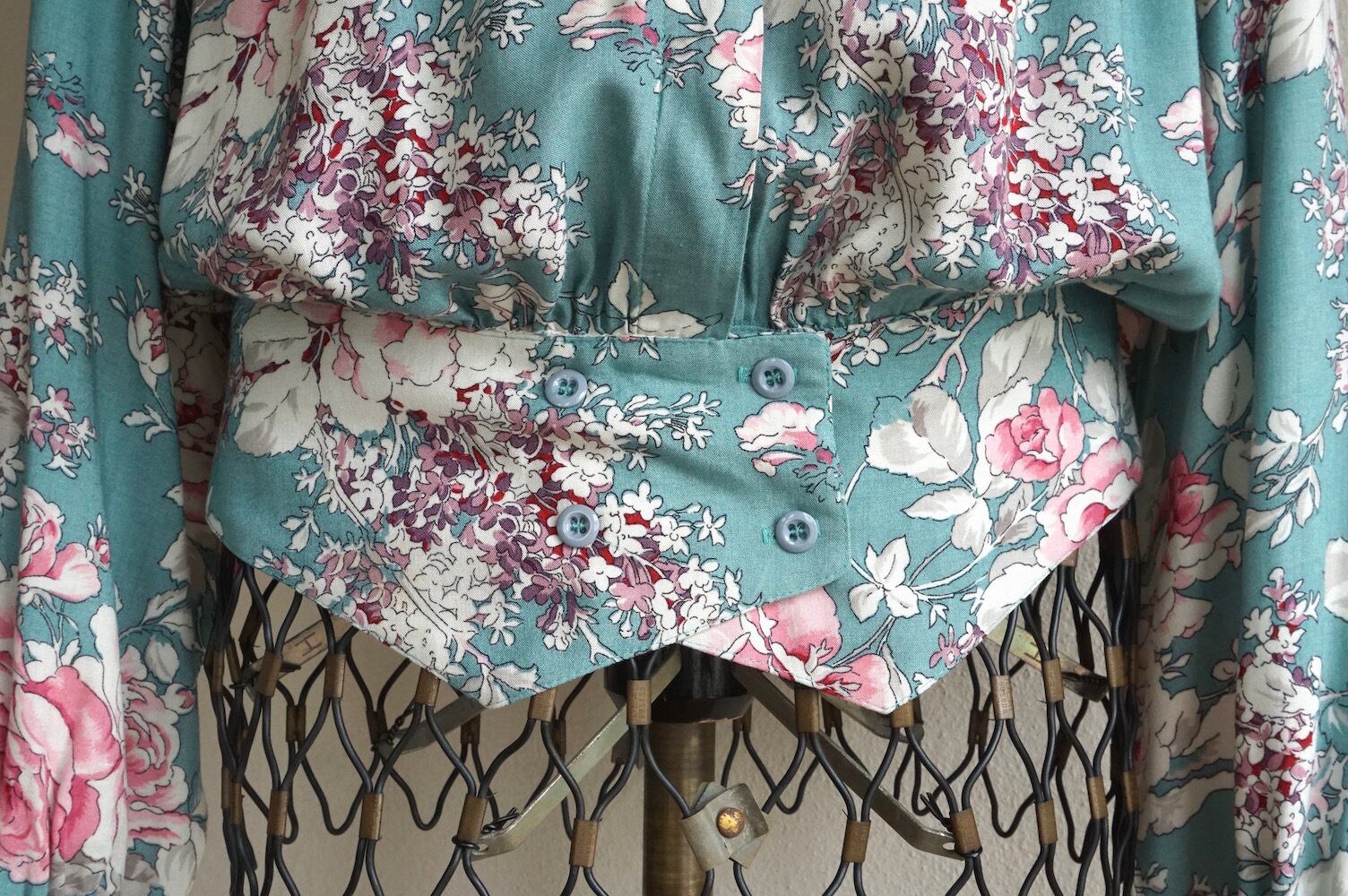 1970’s〜 USA製 [Carole Little] ウエストマークデザイン L/S レーヨンブラウス ターコイズグリーン×フローラル柄 実寸(women's M程度) シャツ ヴィンテージ