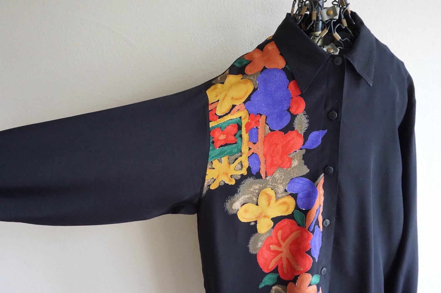 1980’s〜 FRANCE製 アートプリント L/S ヴィスコースブラウス ブラック 実寸(women's M〜L程度) レーヨンシャツ フランス フレンチ ヴィンテージ