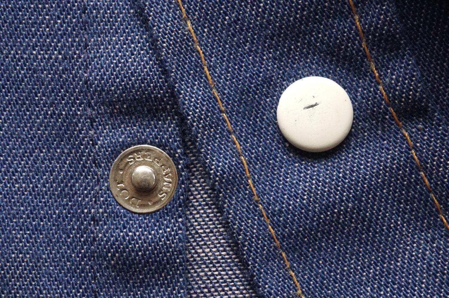 濃紺に映える白ラッカー仕上げの"DOT SNAPPERS"製スナップボタン。