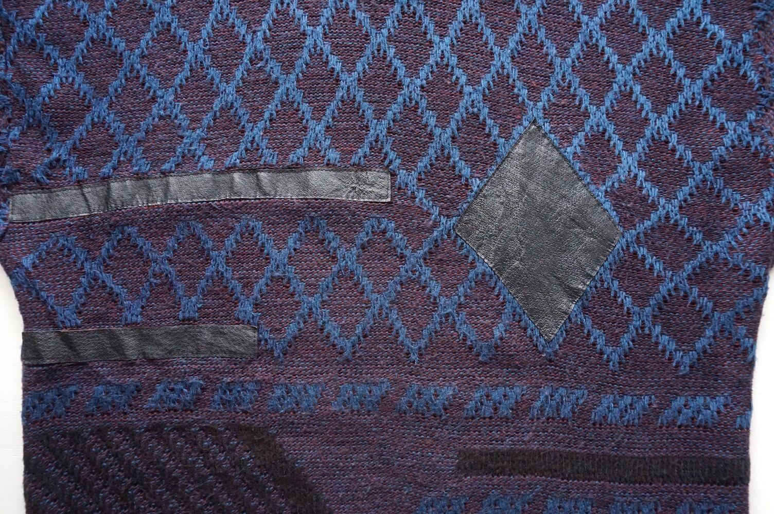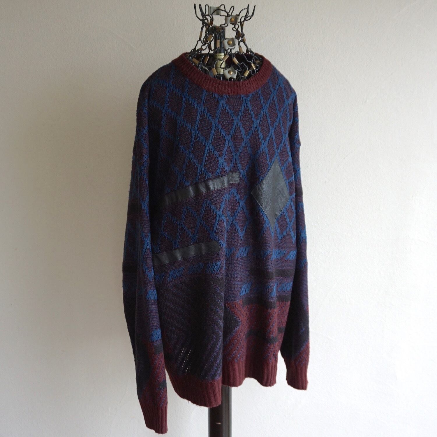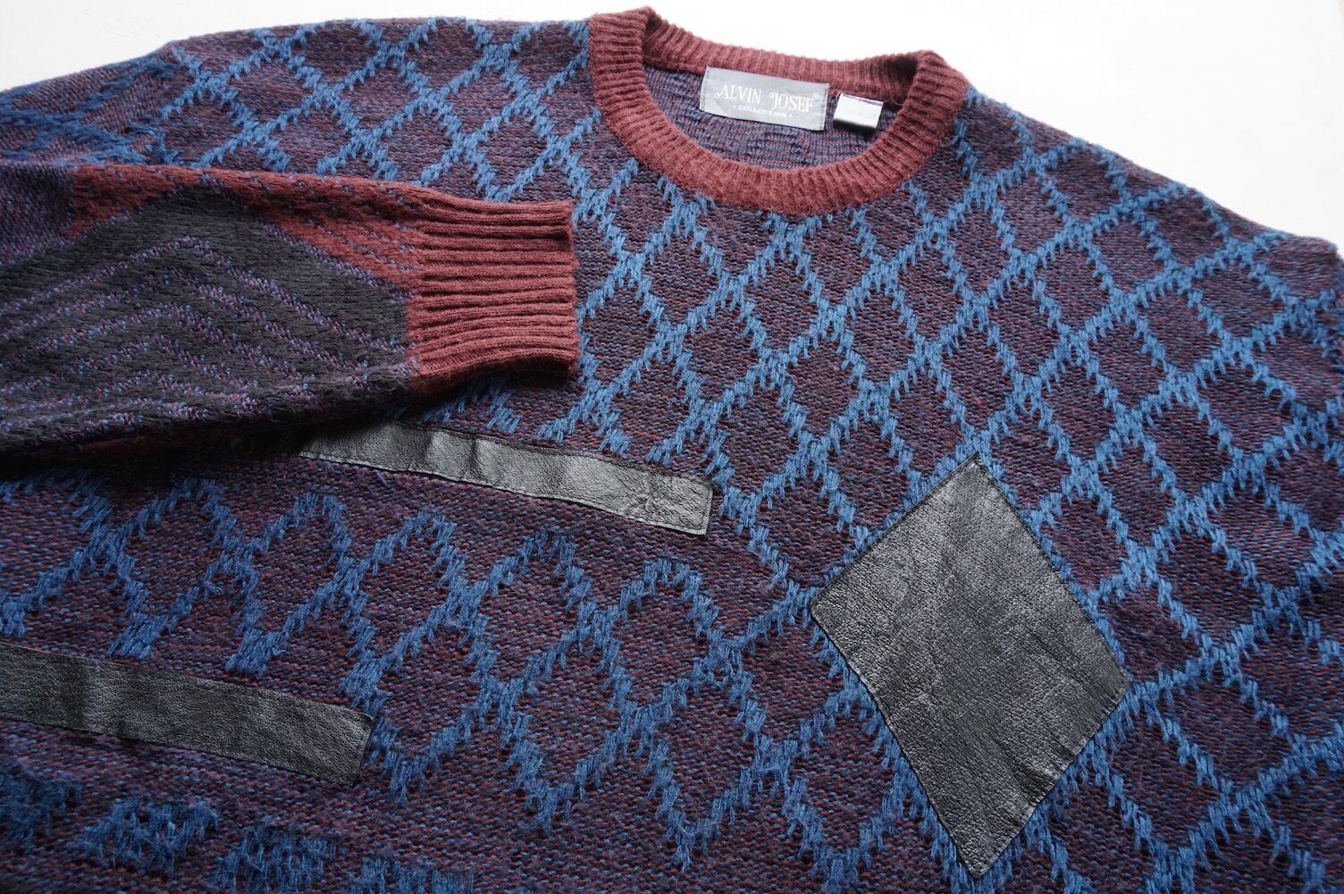 1980's〜 [ALVIN JOSEF] レザーパッチ デザインニットセーター アシンメトリーパターン 表記(XL) ヴィンテージ