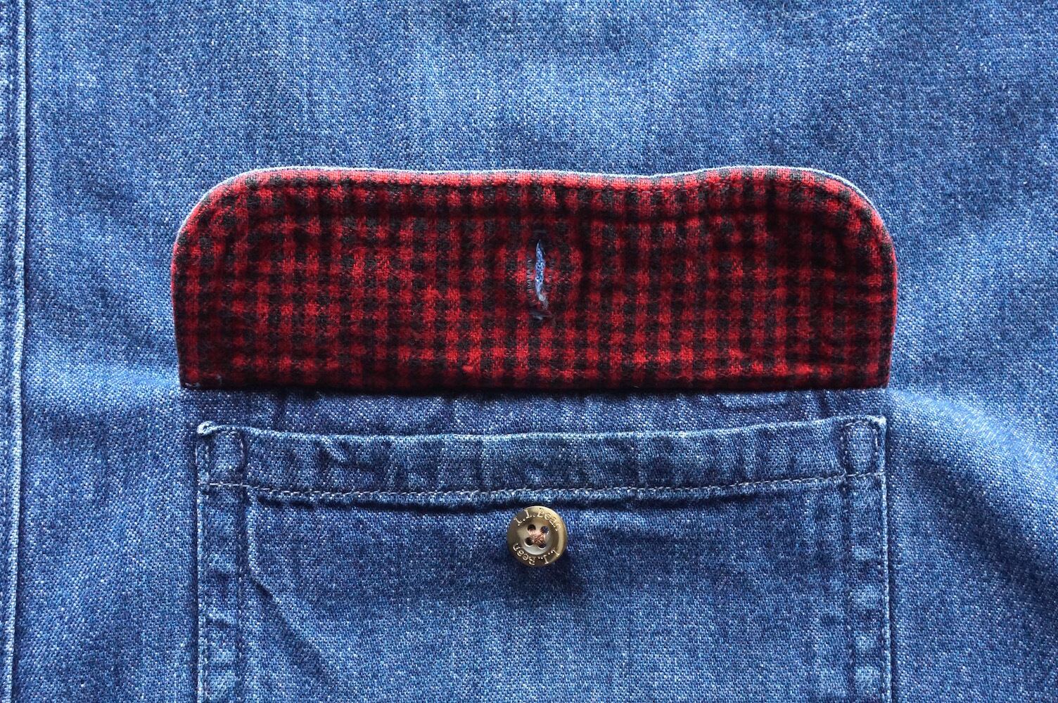 襟元や袖口、ポケットフラップ裏からも覗く赤黒チェック柄が、ブルーデニムと良いコントラスト。