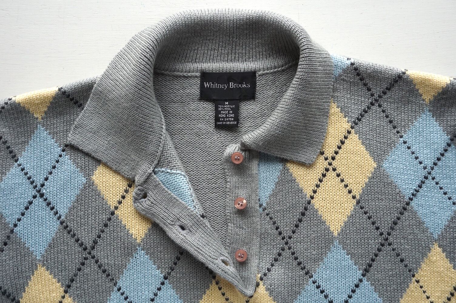 1990's [Whitney Brooks] アーガイル柄 L/S ニットポロシャツ グレー×ライトブルー/ライトイエロー 表記(women's M) セーター ヴィンテージ