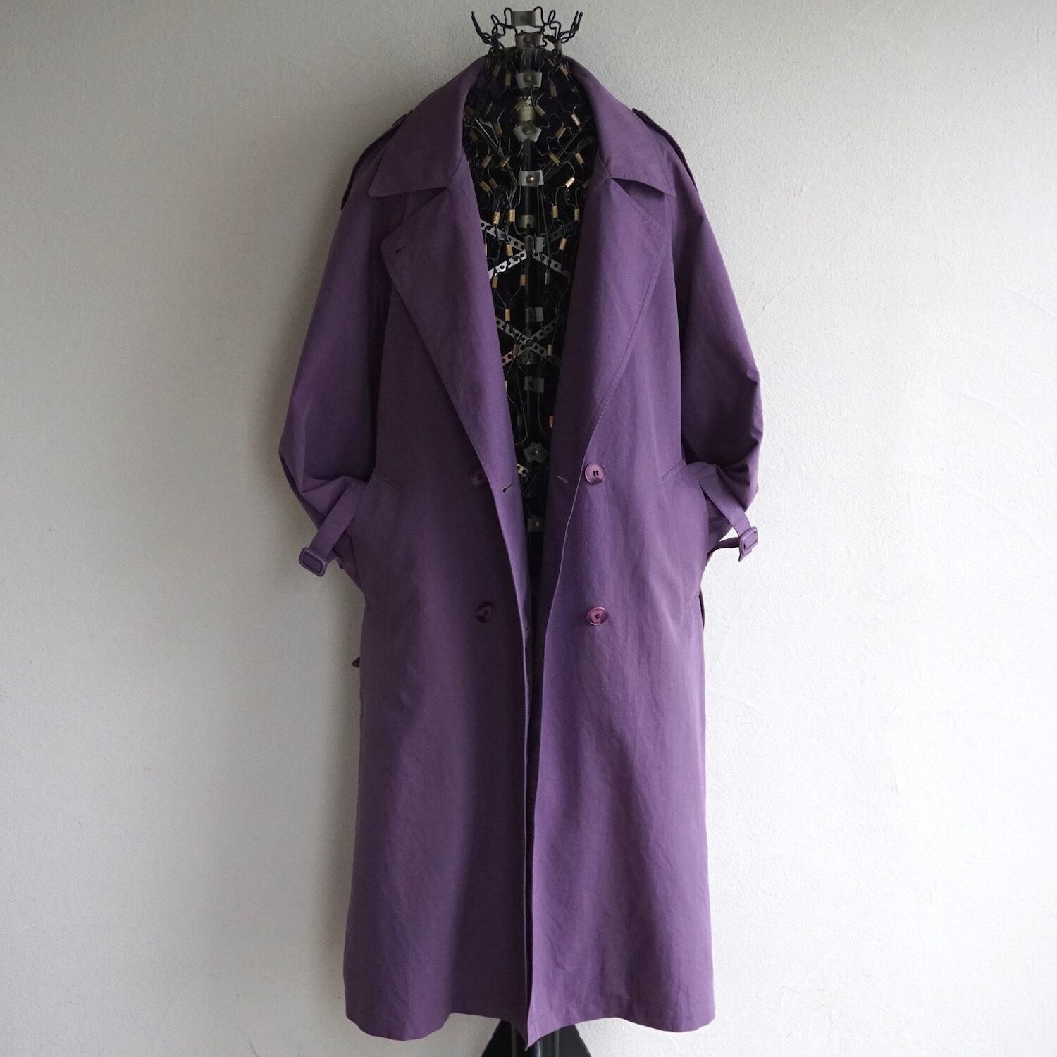 くすみ感が色味の良いモーブパープルのトレンチコート。