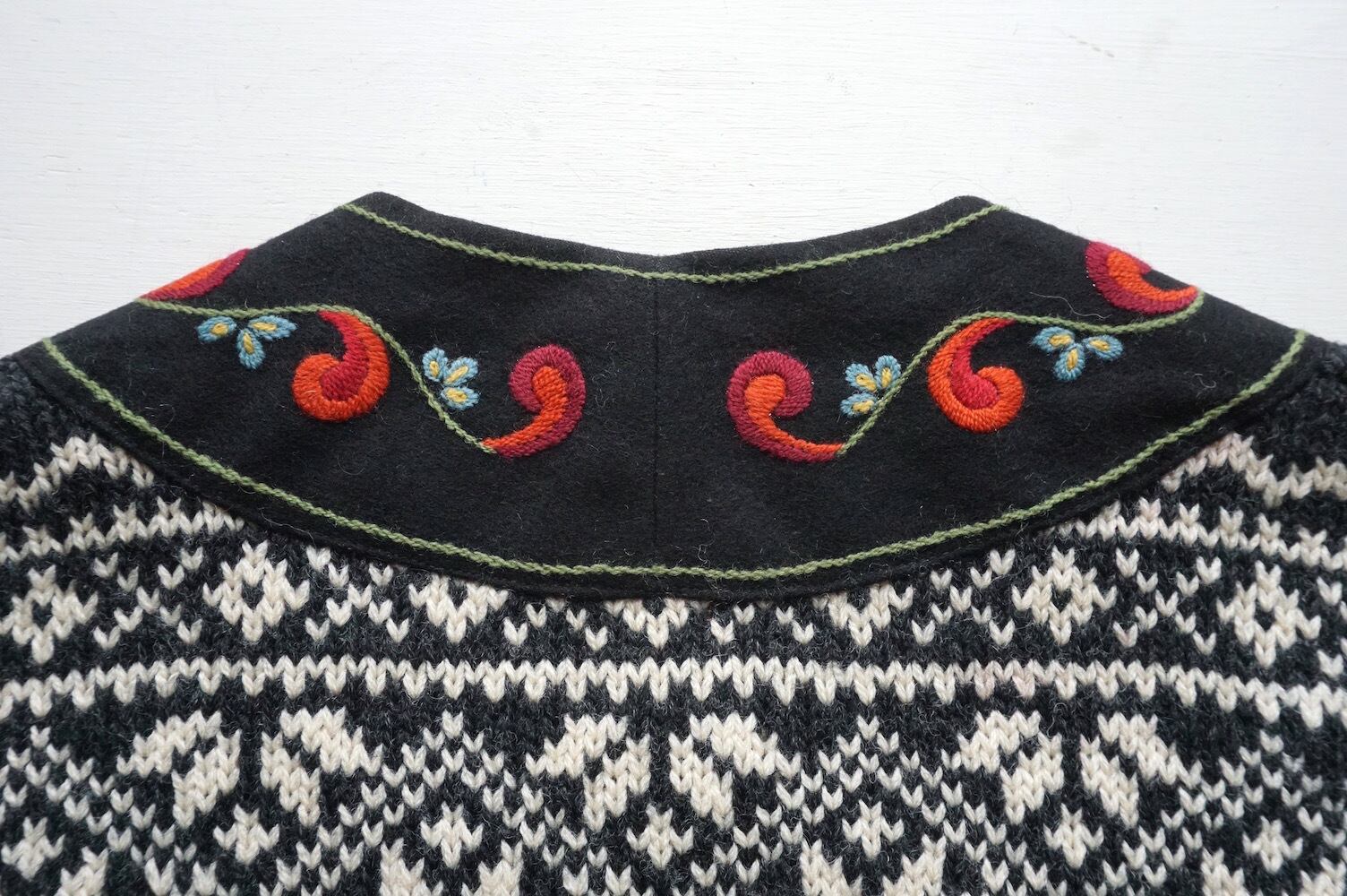 装飾メタルホックとチロリアンテープが伝統的なデザインの、ノルディックニットセーター。