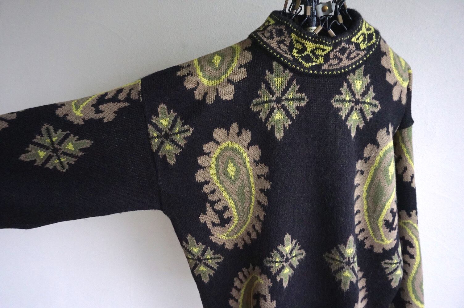 1990's ITALY製 [Legni Verdi] 大柄ペイズリー模様 モックネックニットセーター ブラック×カーキ系 実寸(women's M程度) ヴィンテージ