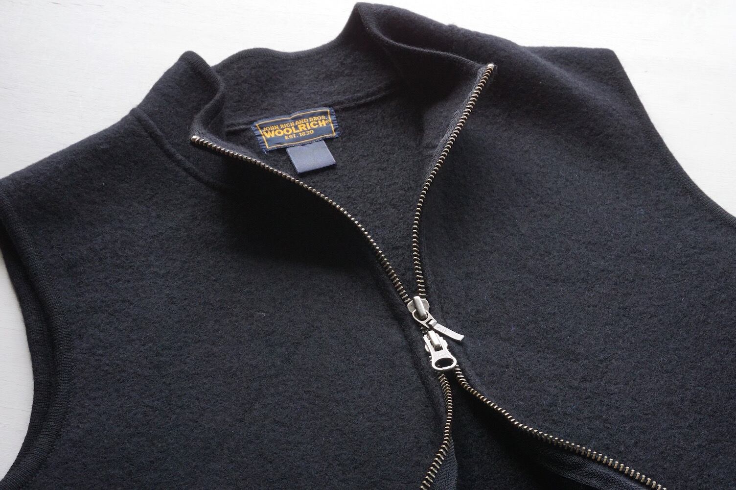 シンプルな無地ブラックのジップアップウールニットベスト。