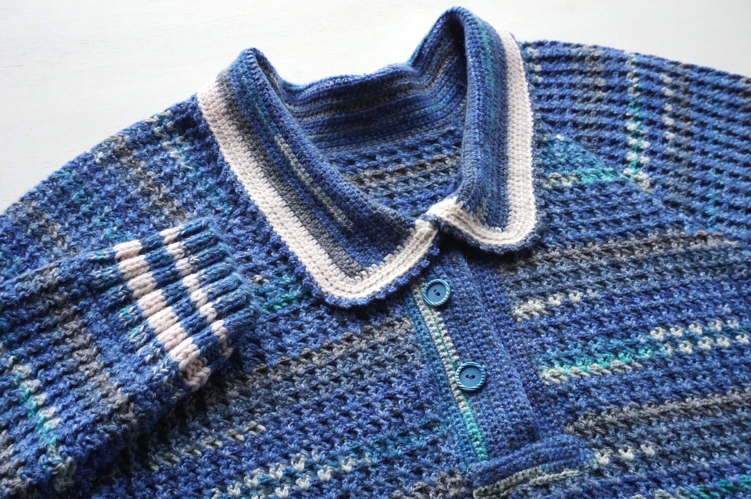 ラグランスリーブのポロシャツ型デザインが可愛い、襟付きニットセーター。