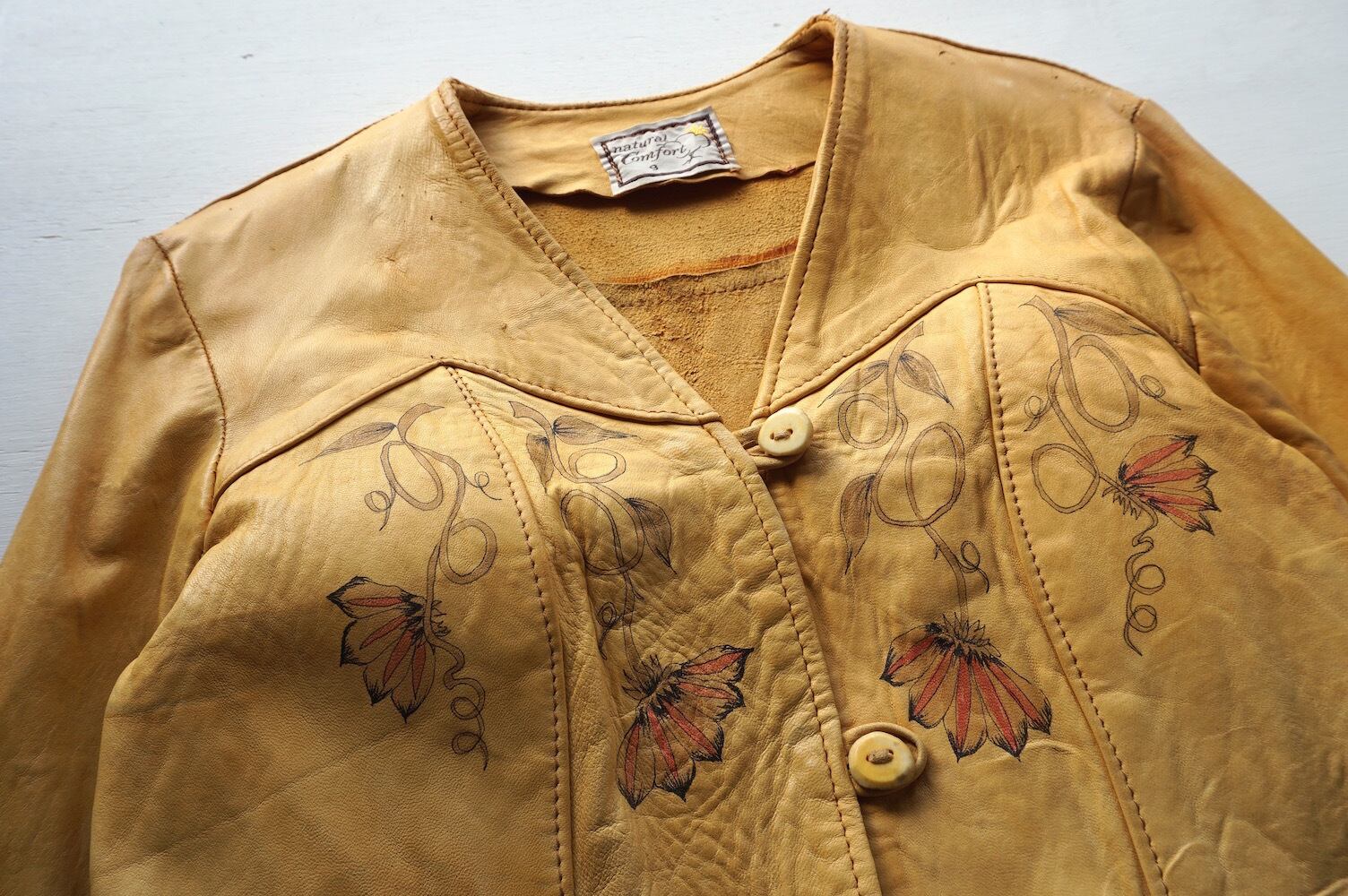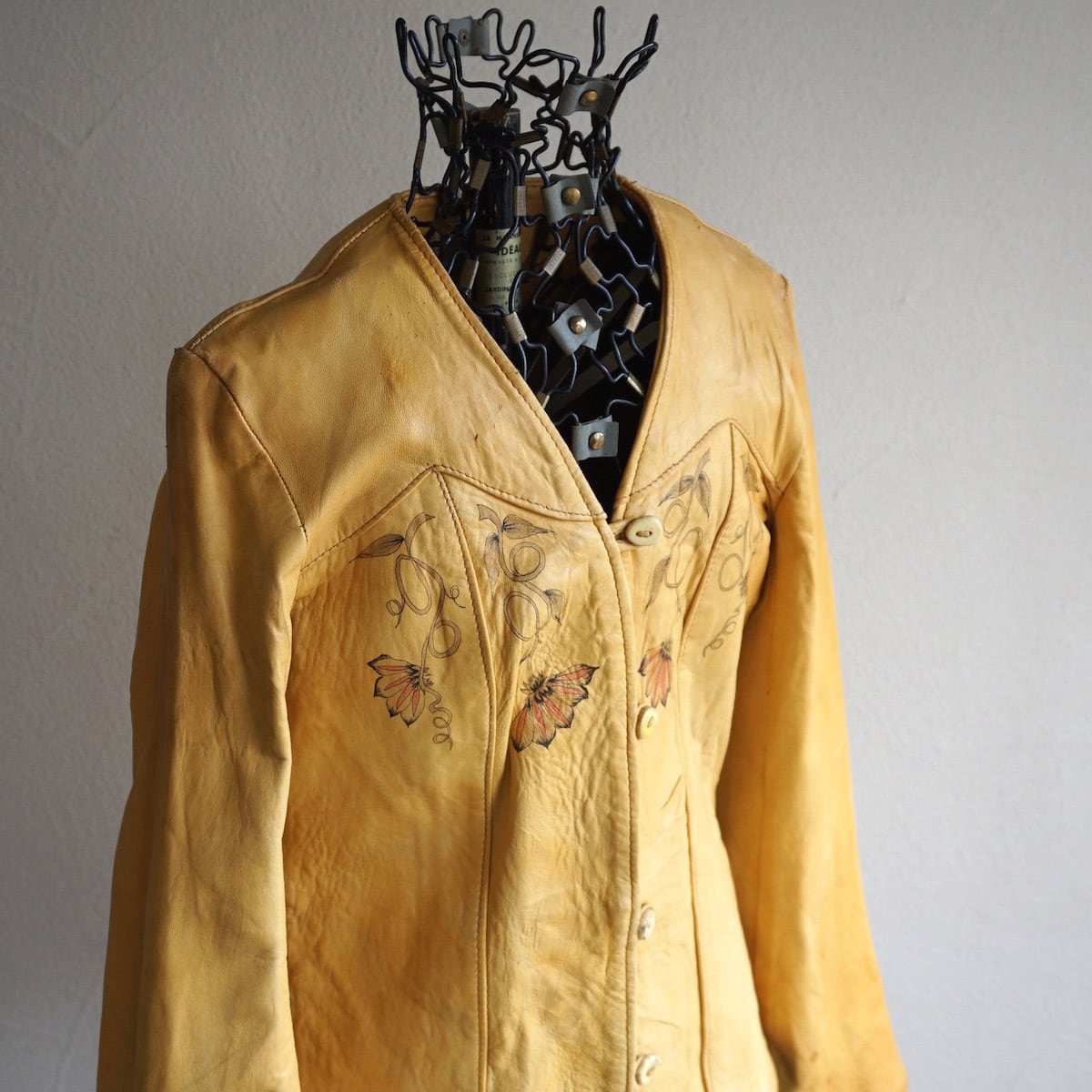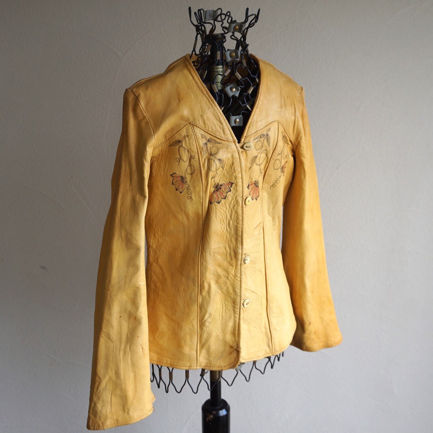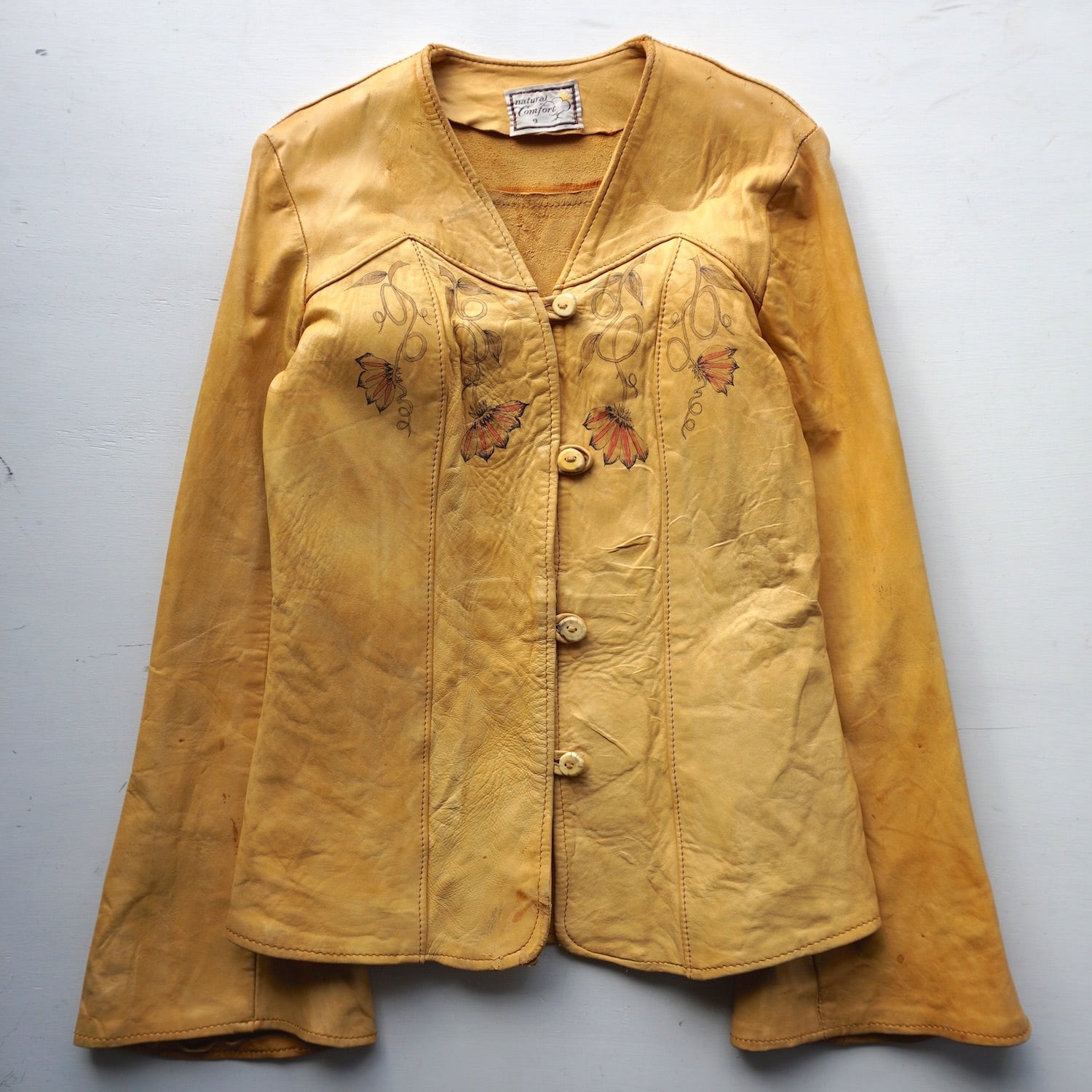 1970's [natural Comfort] フローラルハンドペイント カラーレス&ベルスリーブ クラフトレザージャケット イエローベージュ 表記(women's 9) ナチュラルコンフォート ヒッピー BOHO ヴィンテージ レア