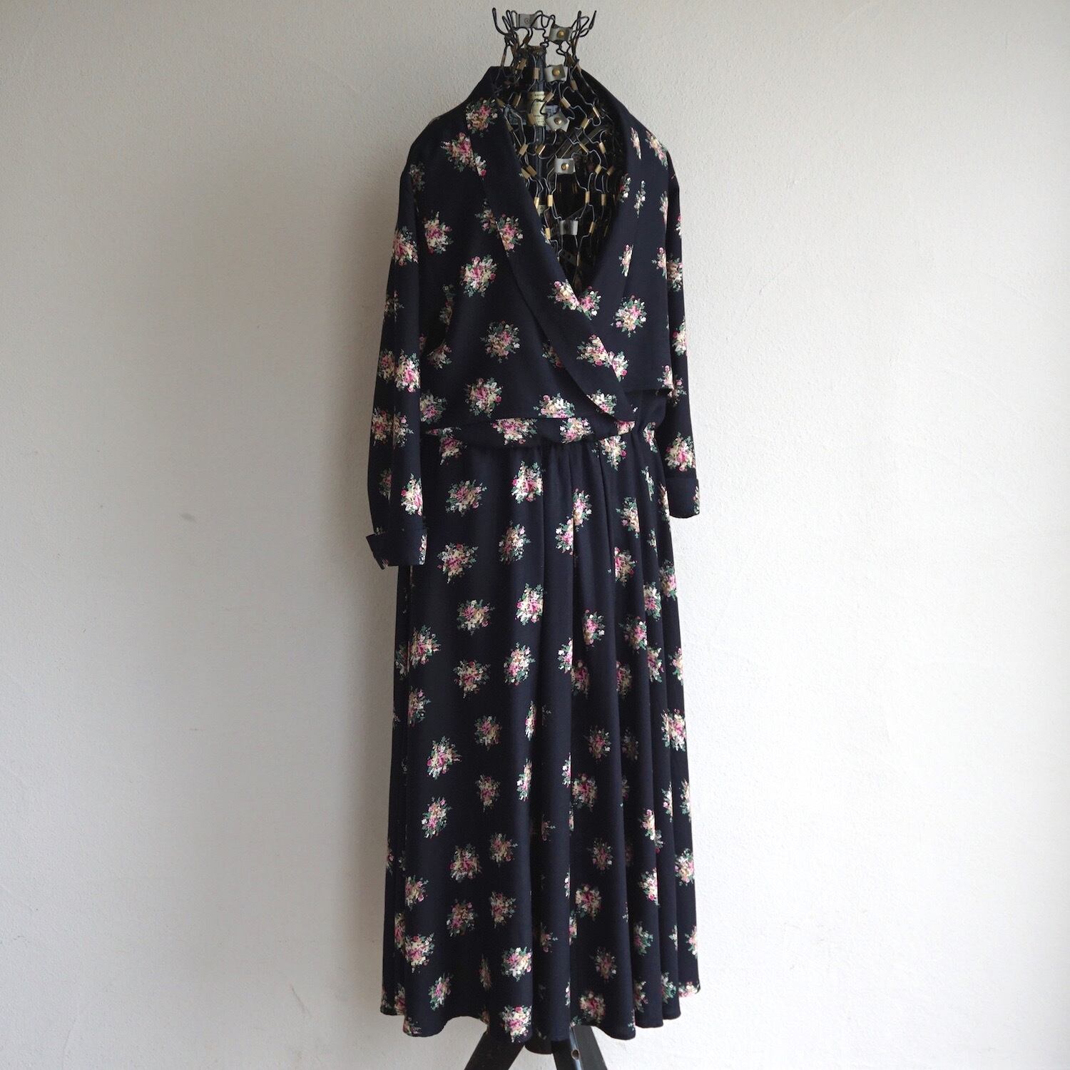 1980's〜 [Styleworks] フローラルプリント ショールカラー&カシュクール L/S レーヨンドレス ブラック 実寸(women's M程度) 花柄 ワンピース ヴィンテージ | MAGNOLIA WEBSTORE