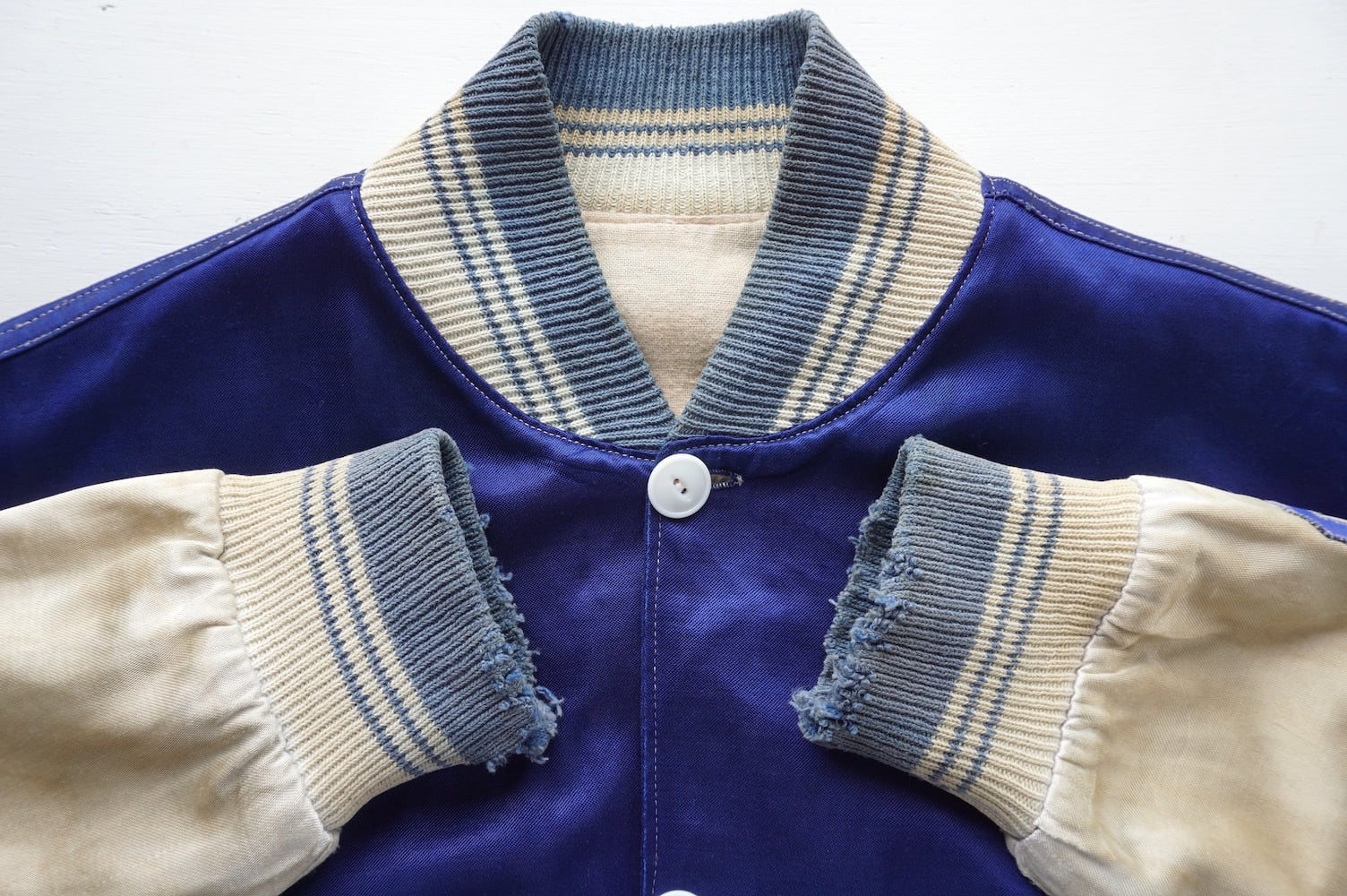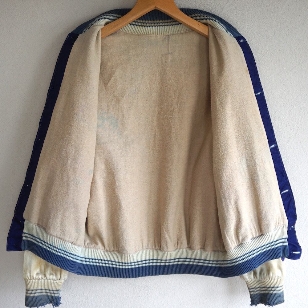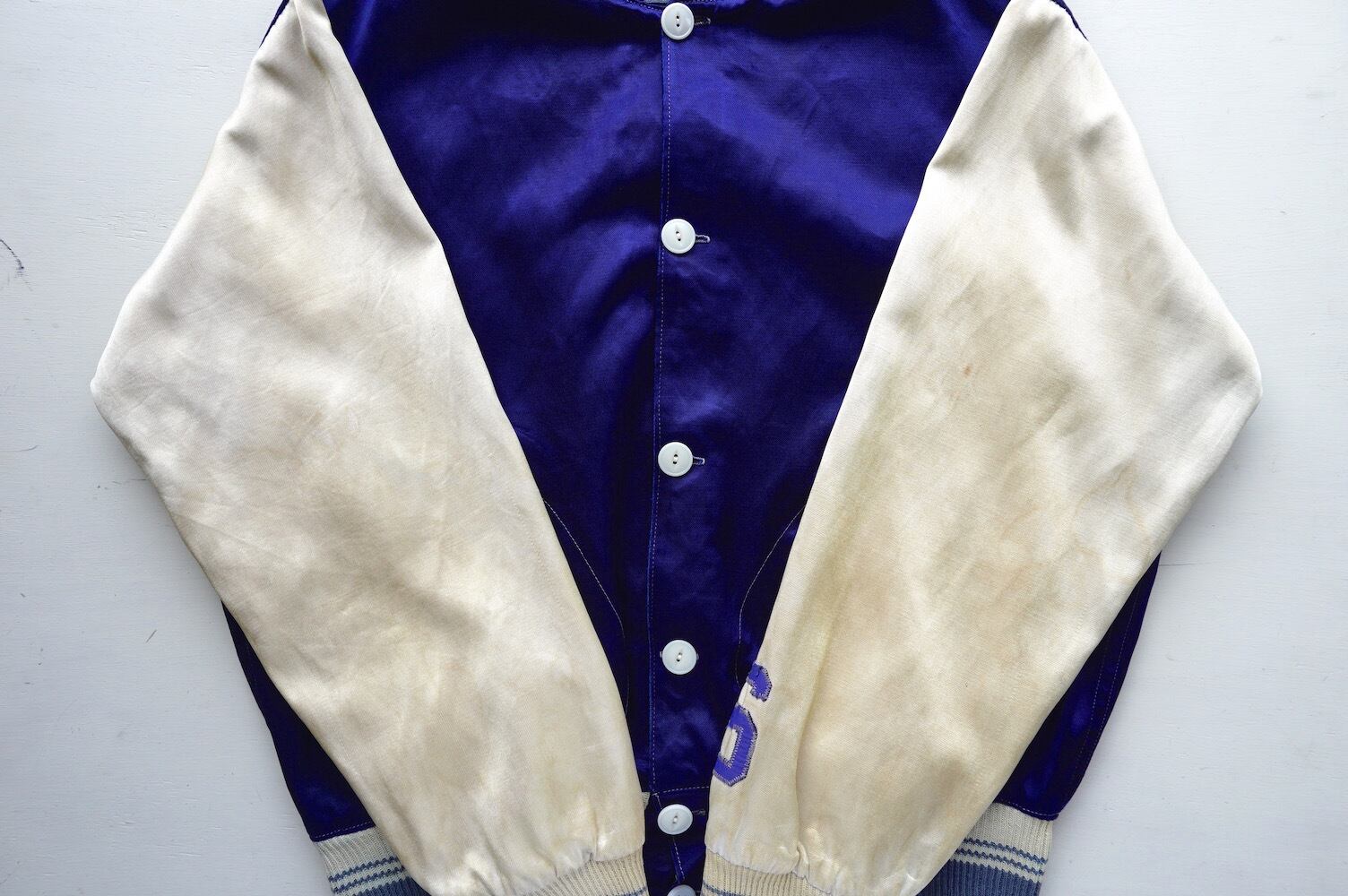 1940's サテン×ボタンタイプ レタードジャケット ブルー×ホワイト 実寸(M程度) ボタンスタジャン ボタスタ ヴィンテージ レア