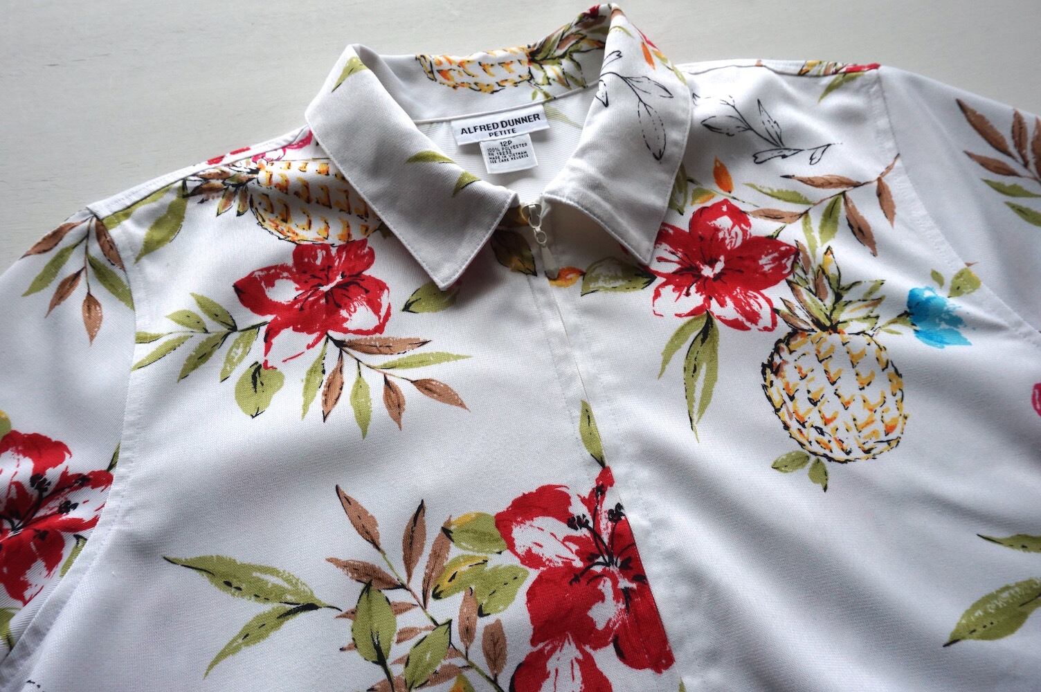 1990's [ALFRED DUNNER] フローラル&パイナップルプリント ドリズラー型ポリエステルジャケット ホワイト 実寸(women's M〜L程度) スウィングトップ 花柄 ヴィンテージ