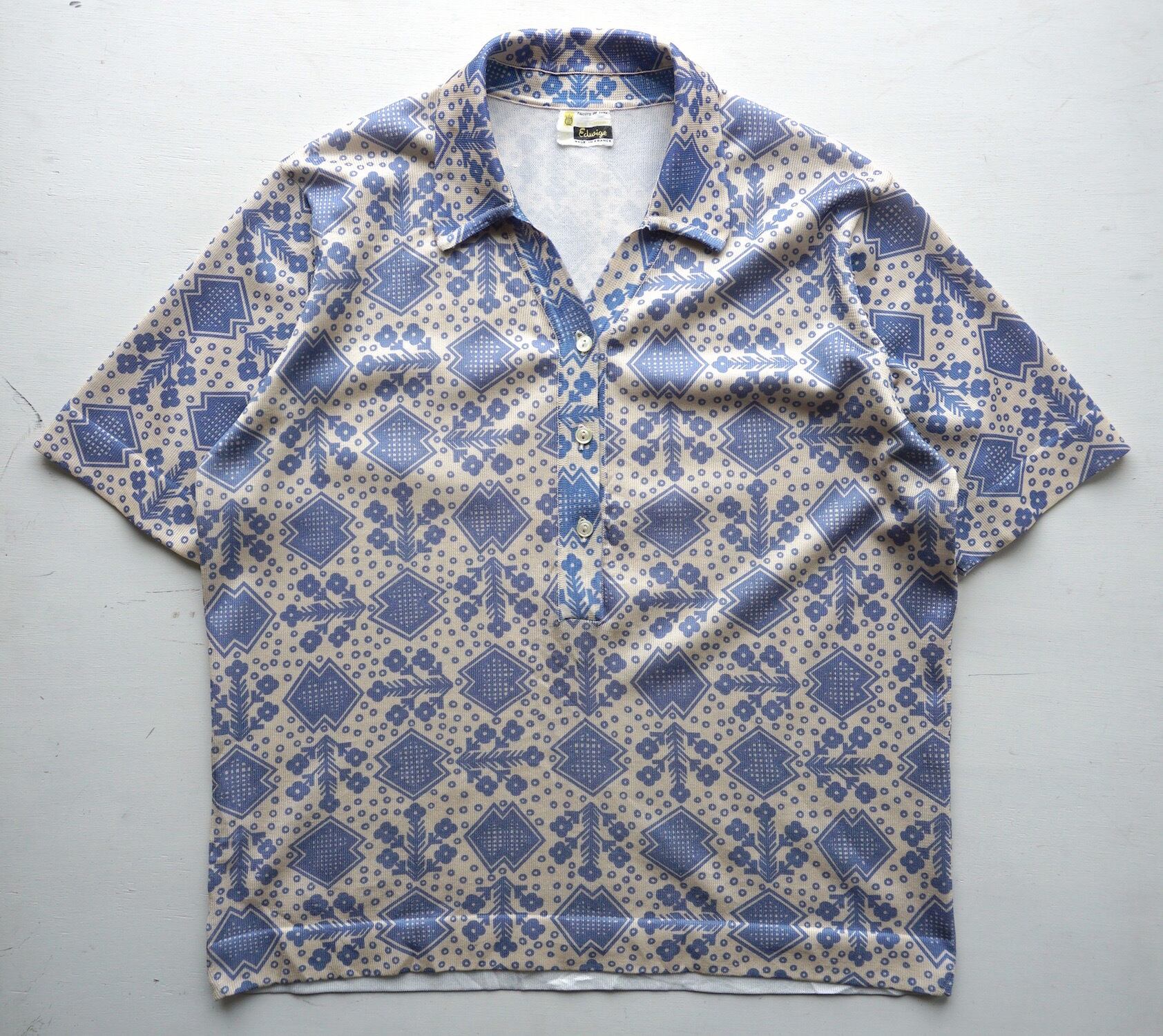 1970's FRANCE製 [Edwige] ポロシャツ型 S/S ポリエステルブラウス アイボリー×ゼニスブルー 実寸(women's M〜L程度) フランス ヴィンテージ
