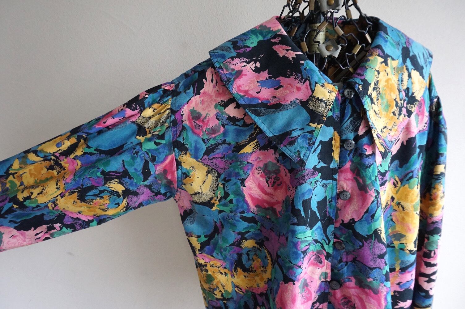 1980's [JEUNESSE] フローラルプリント L/S ビッグカラー デザインブラウス ブラック×マルチ 表記(women's S) 花柄 ヴィンテージ | MAGNOLIA WEBSTORE