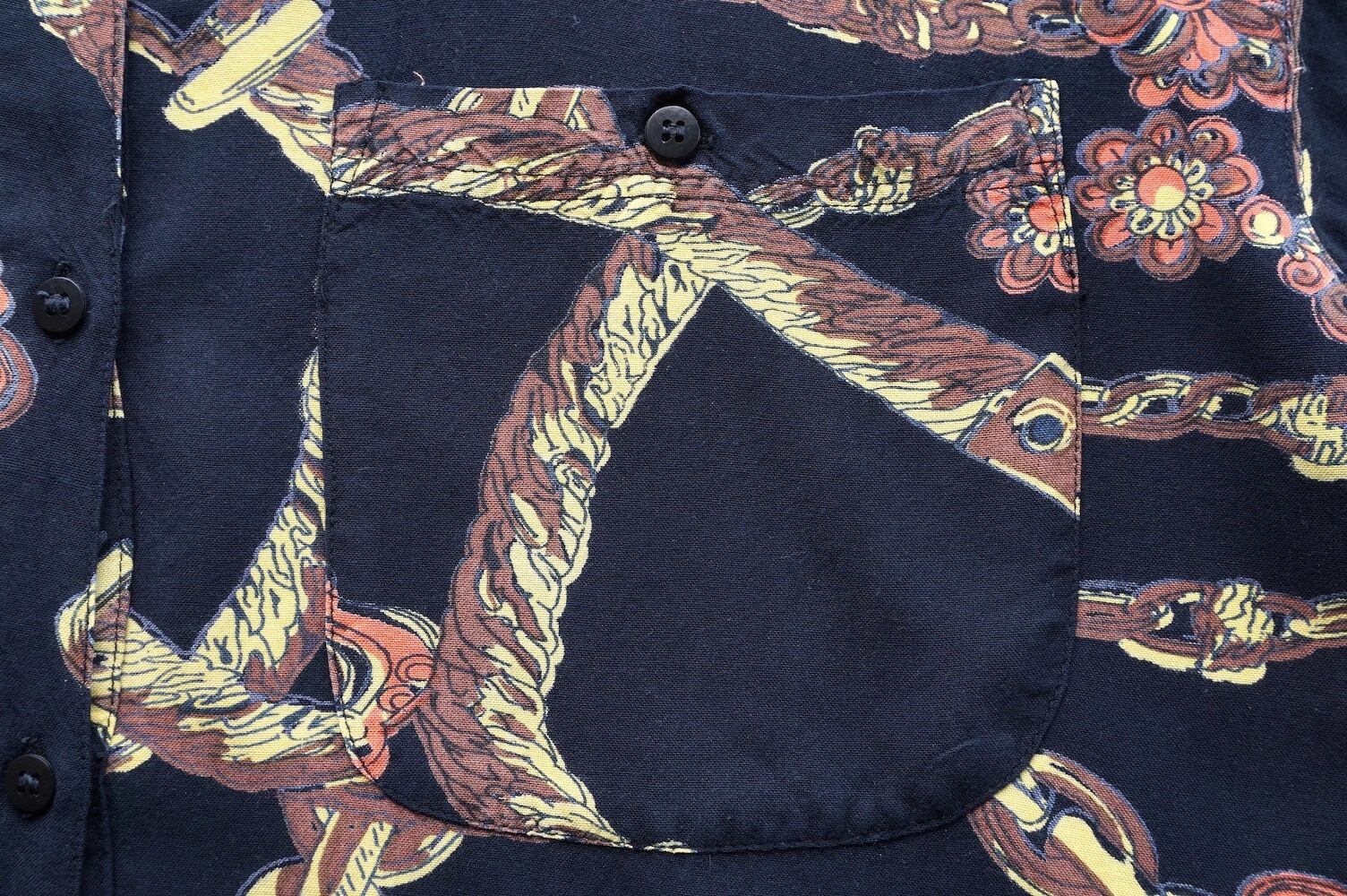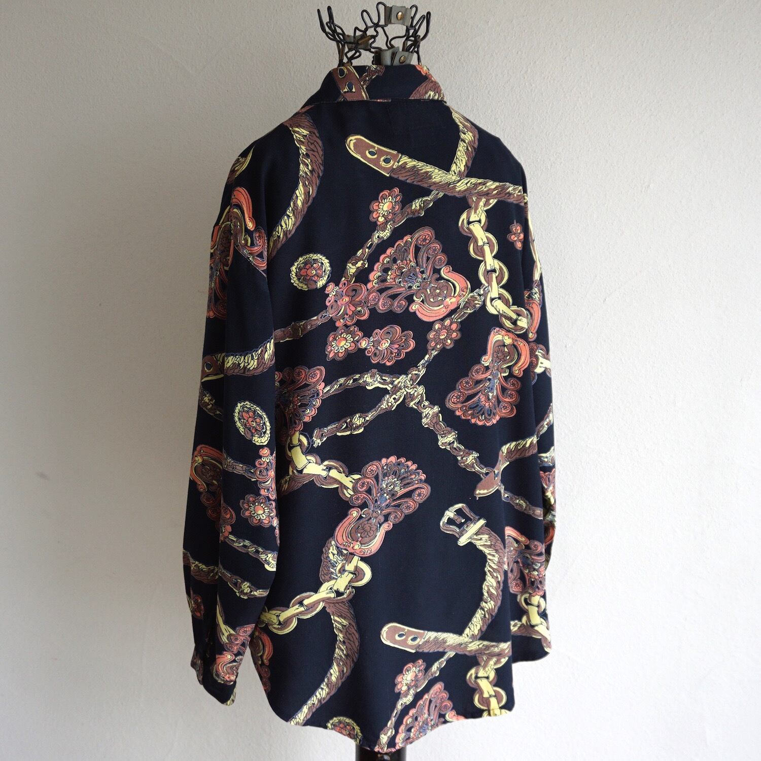 ハイブランドスカーフの様な装飾ベルトプリントがエレガントな、L/Sレーヨンシャツブラウス。