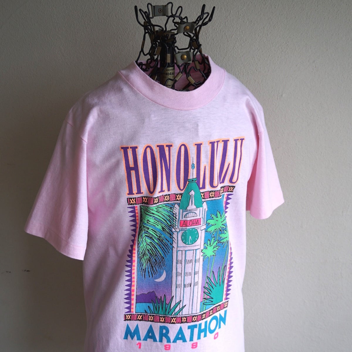 POPなアートワーク&カラーリングがこの年代らしい、'90「ホノルルマラソン」プリントTシャツ。
