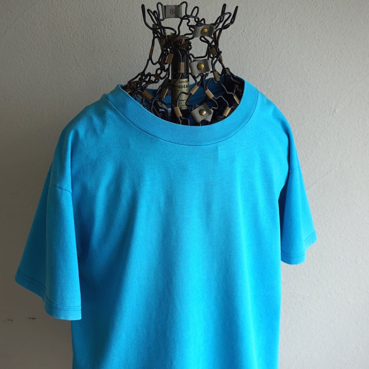 鮮やかなターコイズブルーのS/S無地Tシャツ。
