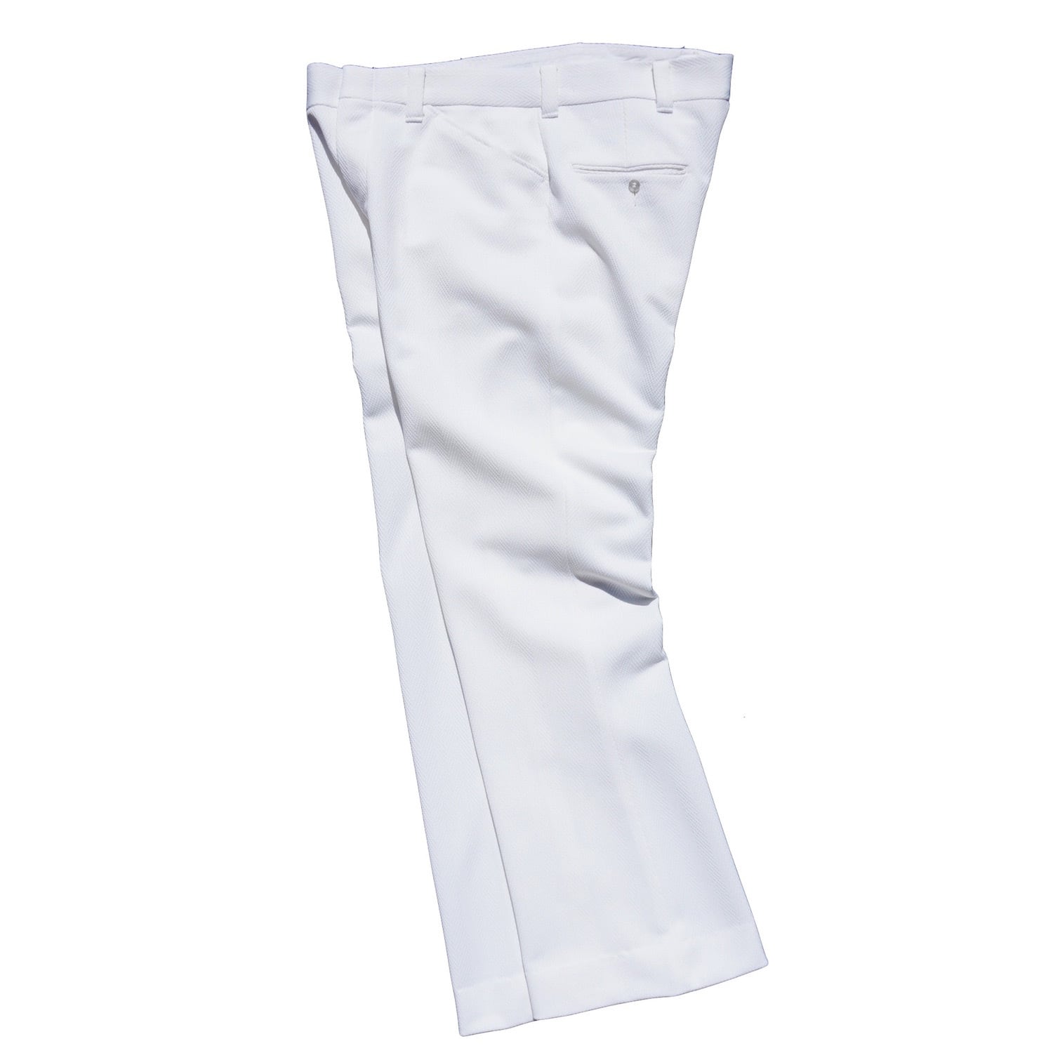綺麗目なスタイリングで合わせられる、ホワイトのポリエステルスラックス。