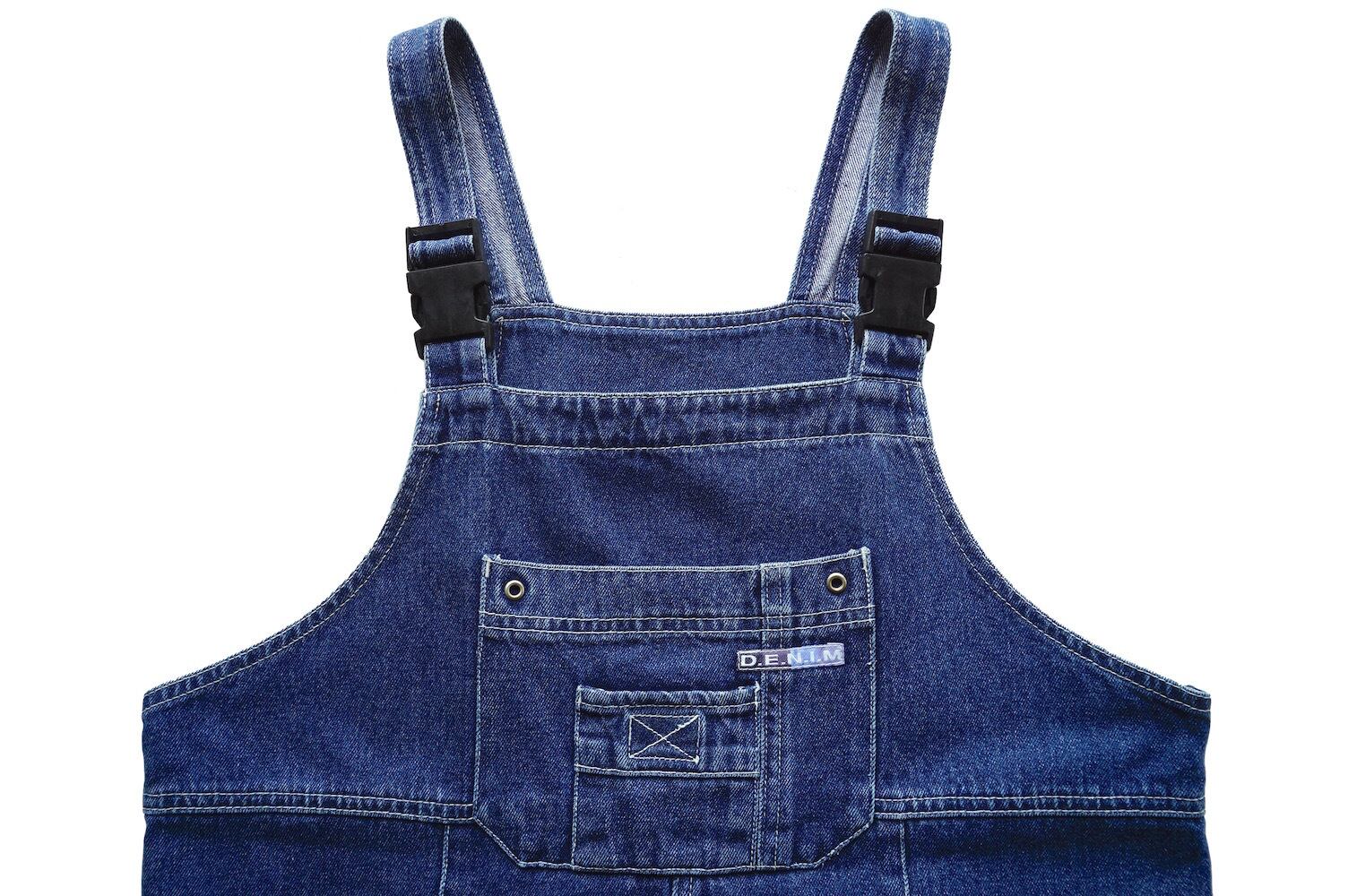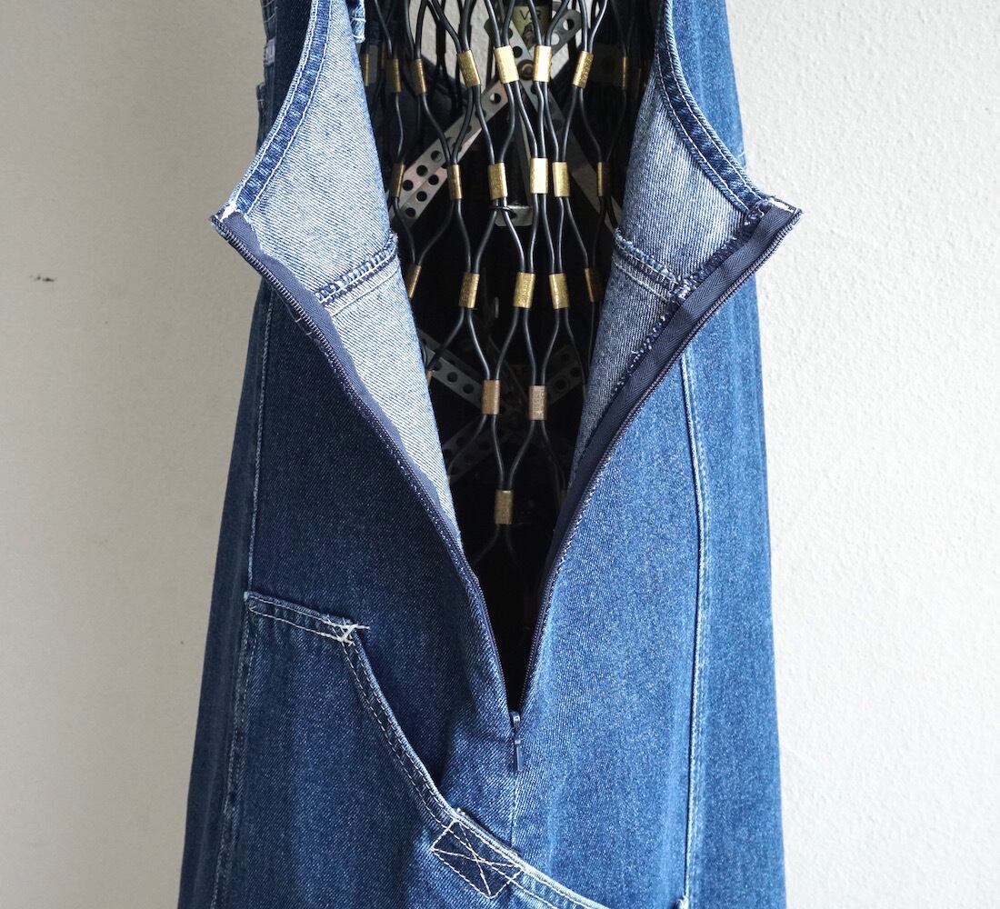 オーバーオールの様なワークデザインが可愛い、デニムサロペットドレス。