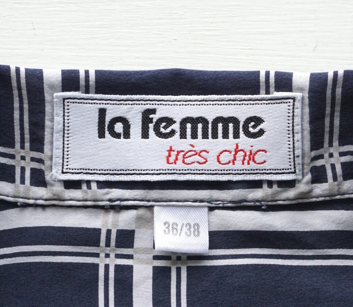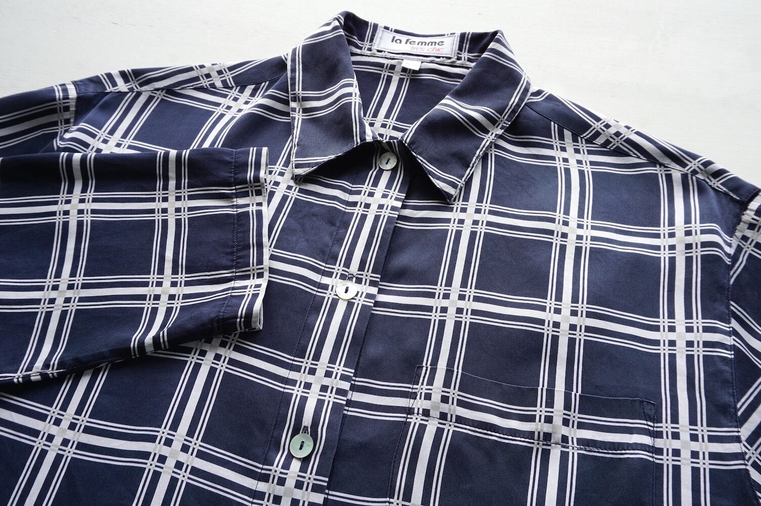1990's [la femme tres chic] 100%シルク L/S シャツブラウス ネイビー×ホワイト/グレー 表記(women's 36/38) ユーロ ヨーロッパ ヴィンテージ