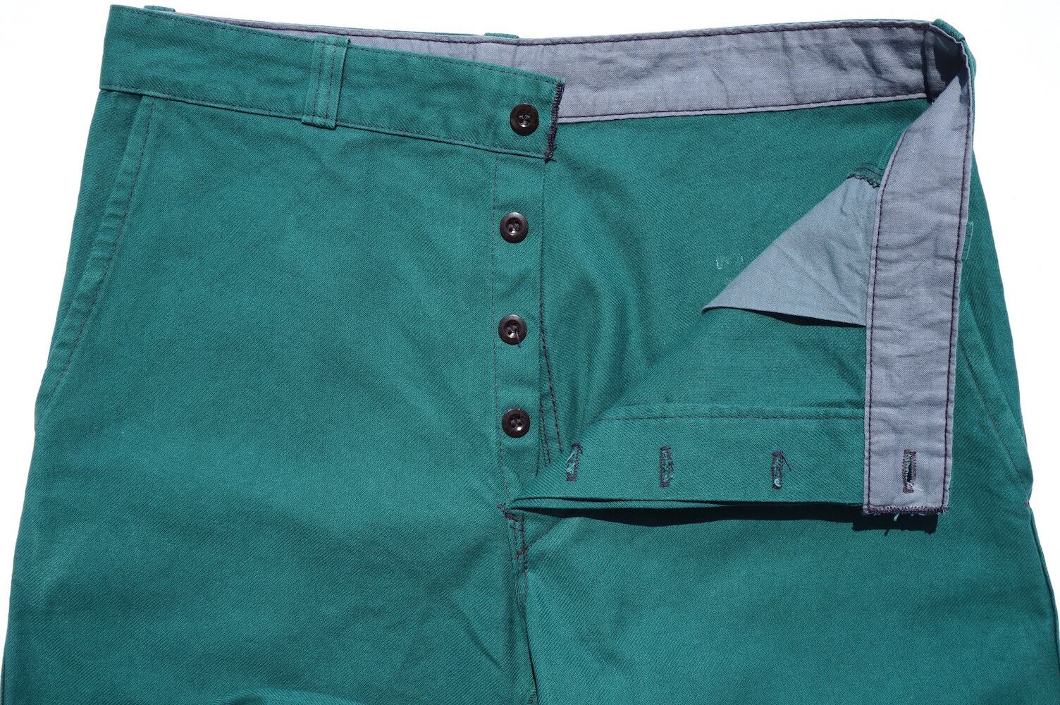 レアカラー、色味の良いアパッチグリーンの、フレンチワークパンツ。