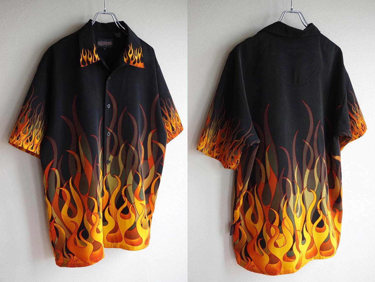 迫力あるファイヤーパターンのS/SオープンカラーBOXシャツ。