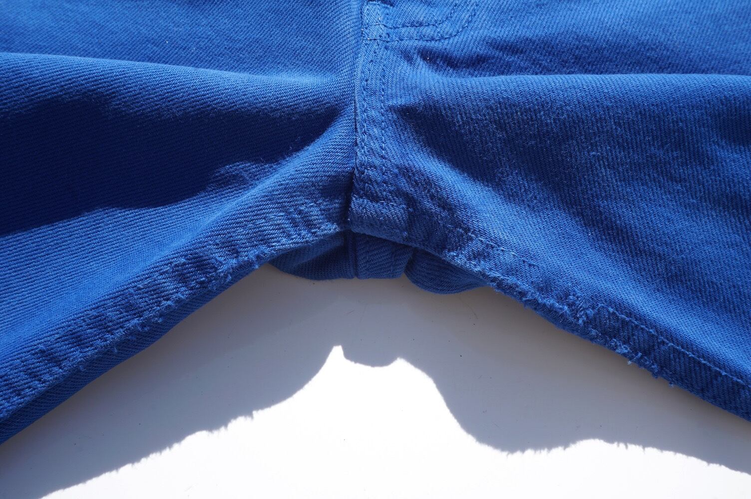 綺麗なスリムテーパードシルエットにリフォームされた、鮮やかなオーバーダイ(後染め)ブルーの「501」。