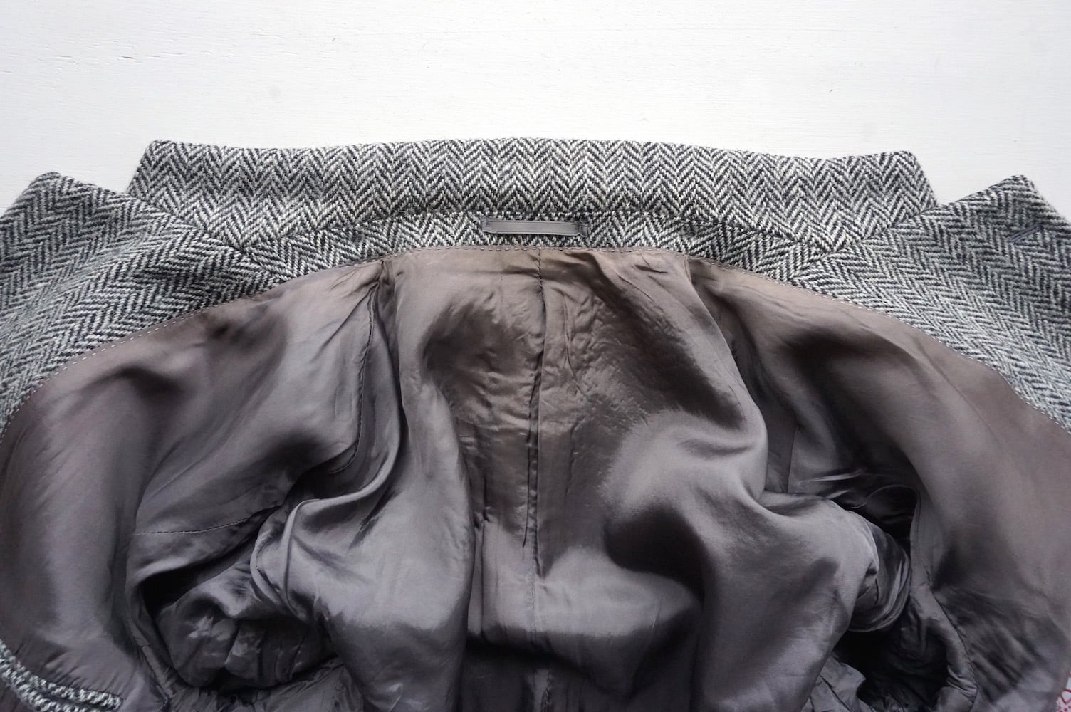 モノトーンなヘリンボーン柄の、2ボタンテーラードツイードジャケット。