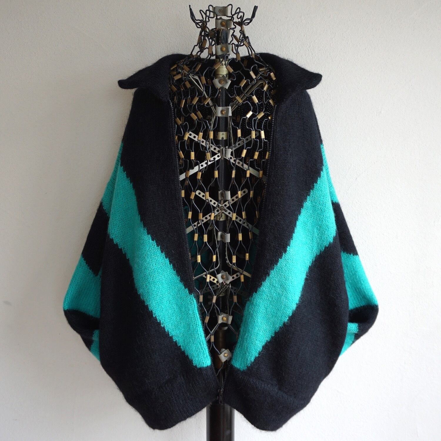 1980's〜 モヘアmix フルジップニットブルゾン ブラック×シーグリーン 実寸(women's XL程度) カーディガン ジャケット ヴィンテージ