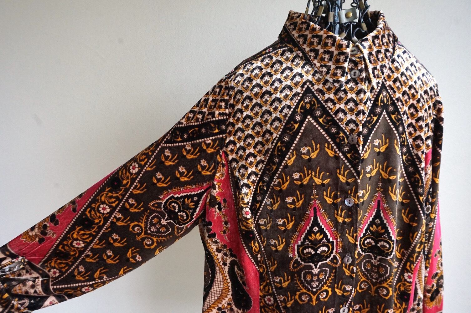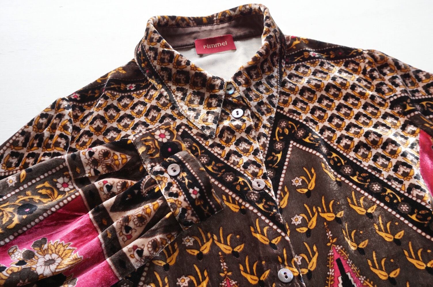 1990's ITALY製 [rimmel] ダマスクプリント レーヨン×シルク L/S ベルベットブラウス ブラウン×ピンク系 実寸(women's M〜L程度) アラベスク ペルシャ絨毯柄 イタリア ヴィンテージ | MAGNOLIA WEBSTORE