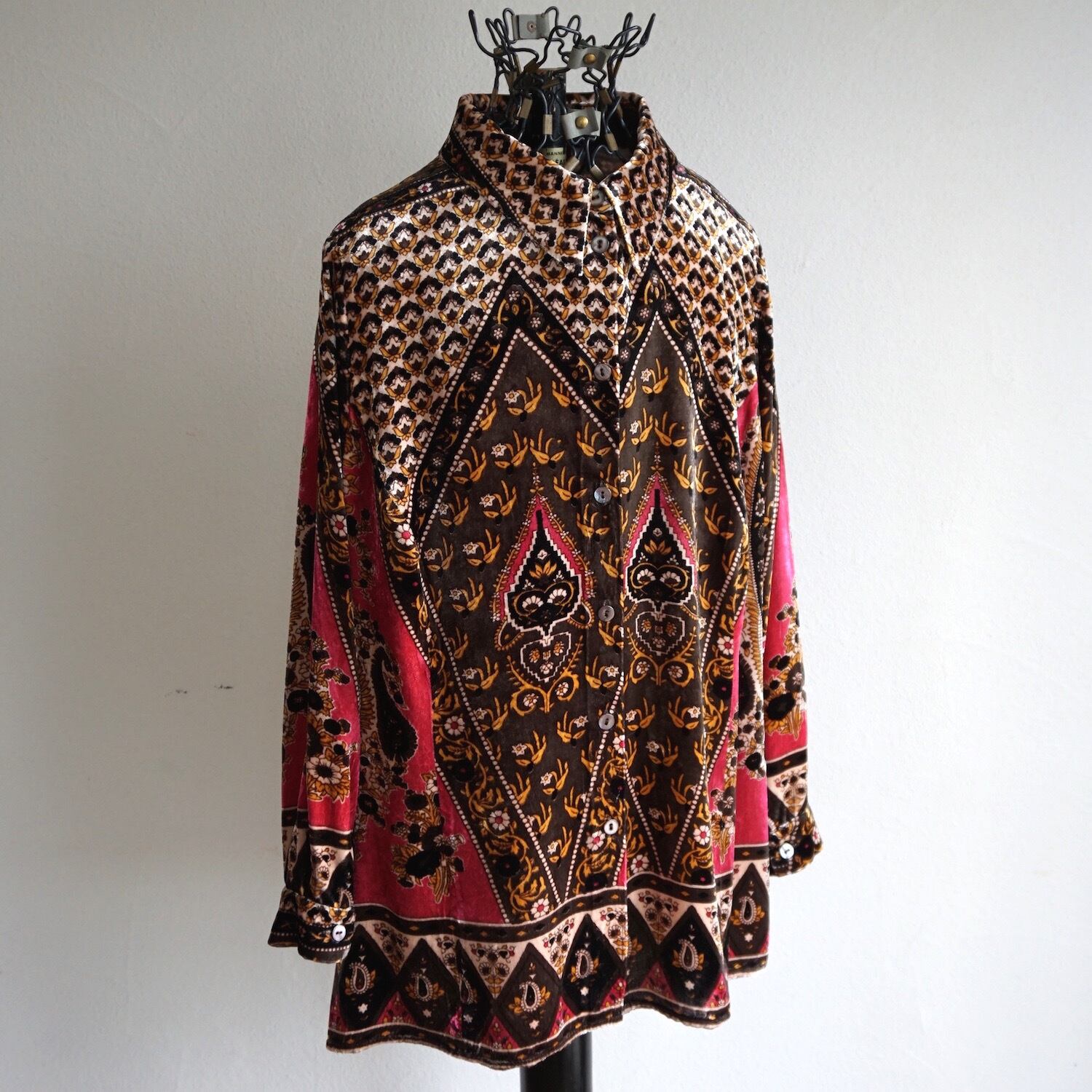 ペルシャ絨毯の様なダマスクプリントが美しい、L/Sベルベットブラウス。