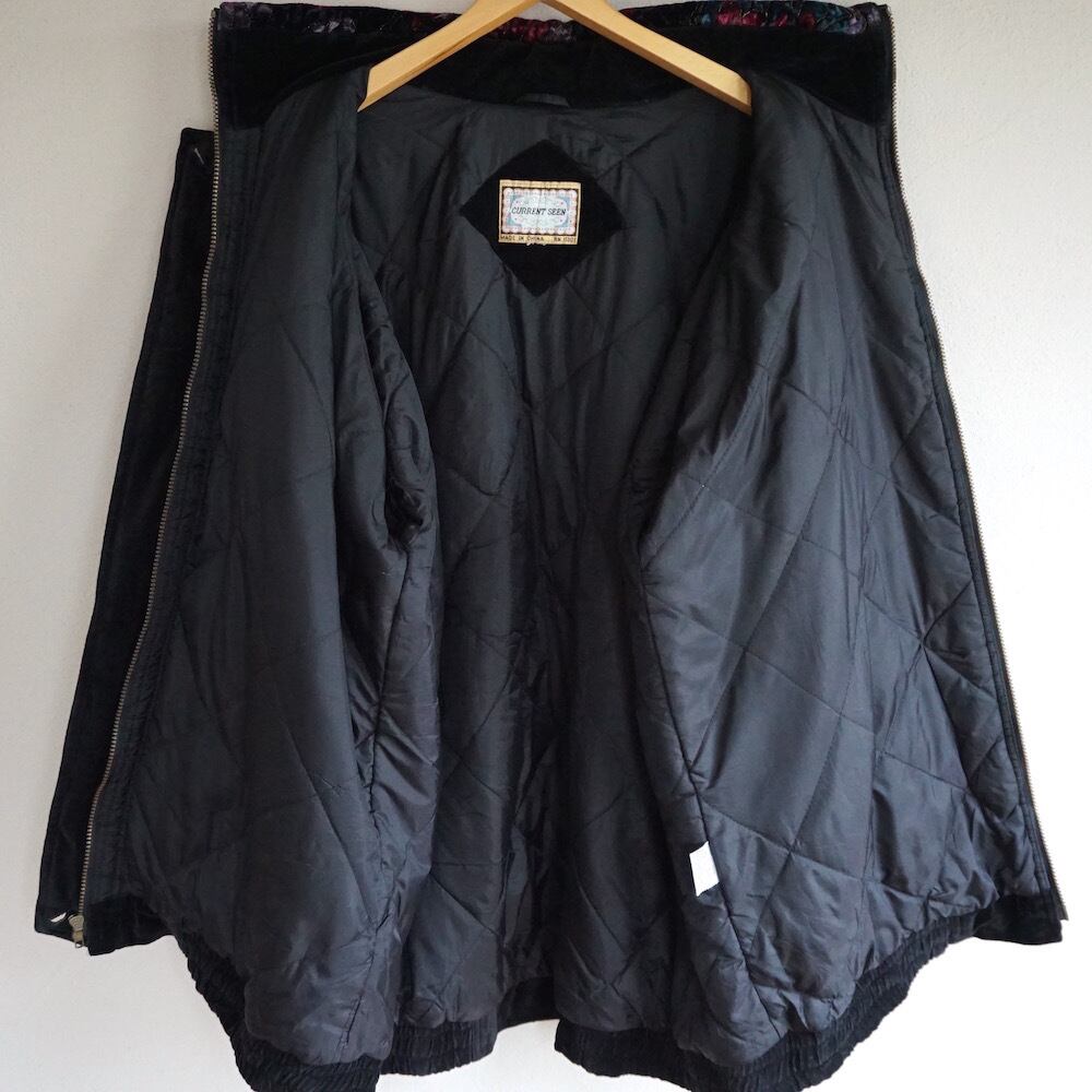 1980's〜90's [CURRENT SEEN] ビッグシルエット ベルベットパディングジャケット ブラック×フローラル 実寸(women's XL程度) キルティング中綿 ジップアップ ハイネック ヴィンテージ