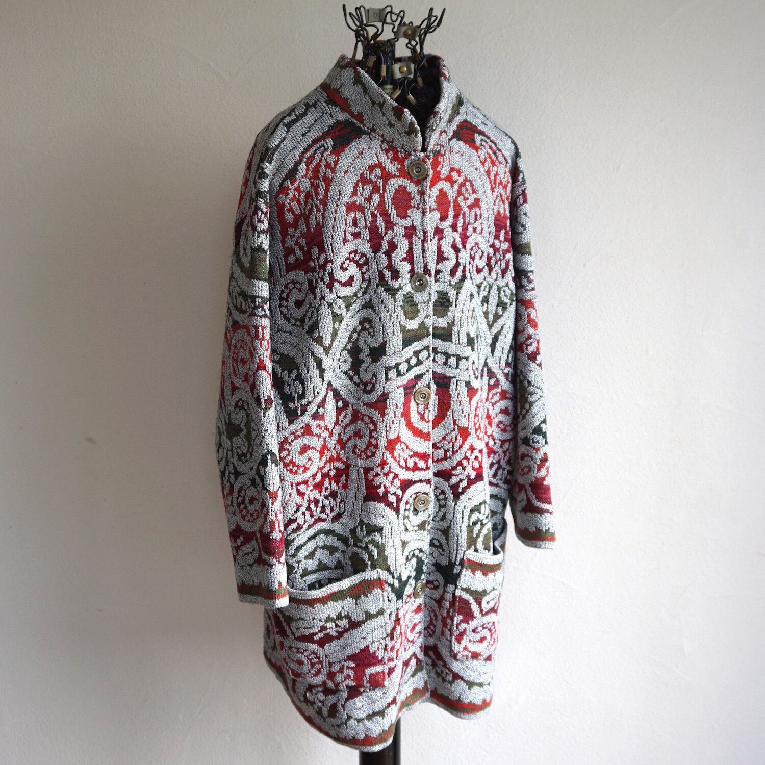 1970's〜80's FRANCE製 [Lidrey] バロックパターン ロングニットカーディガン グレー×グリーン/レッド 実寸(women's L程度) アラベスク ダマスク フランス ヨーロッパ ヴィンテージ