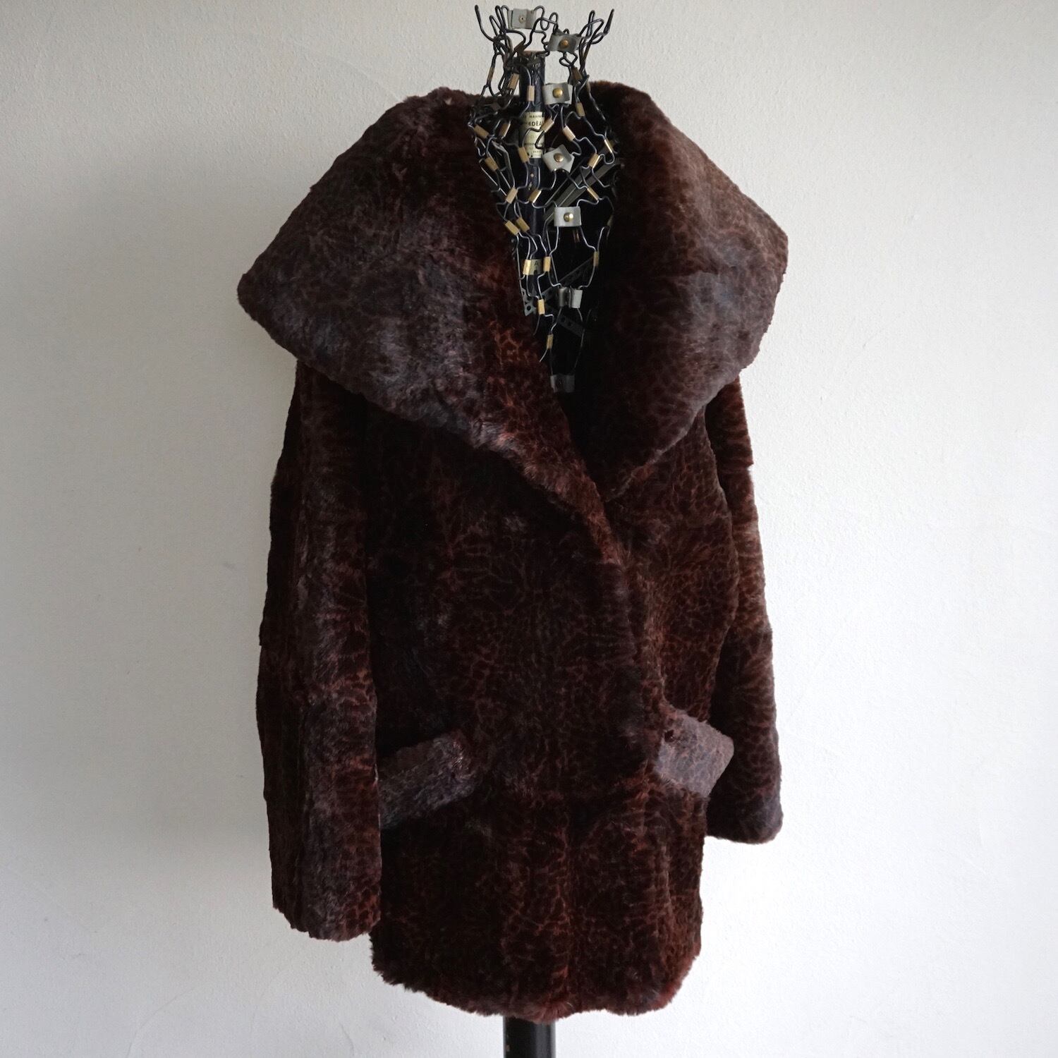 1980's [LEGENDERS] アニマル/ボタニカルプリント ビッグショールカラー リアルファーコート ダークブラウン系 表記(women's S) 毛皮 ヴィンテージ