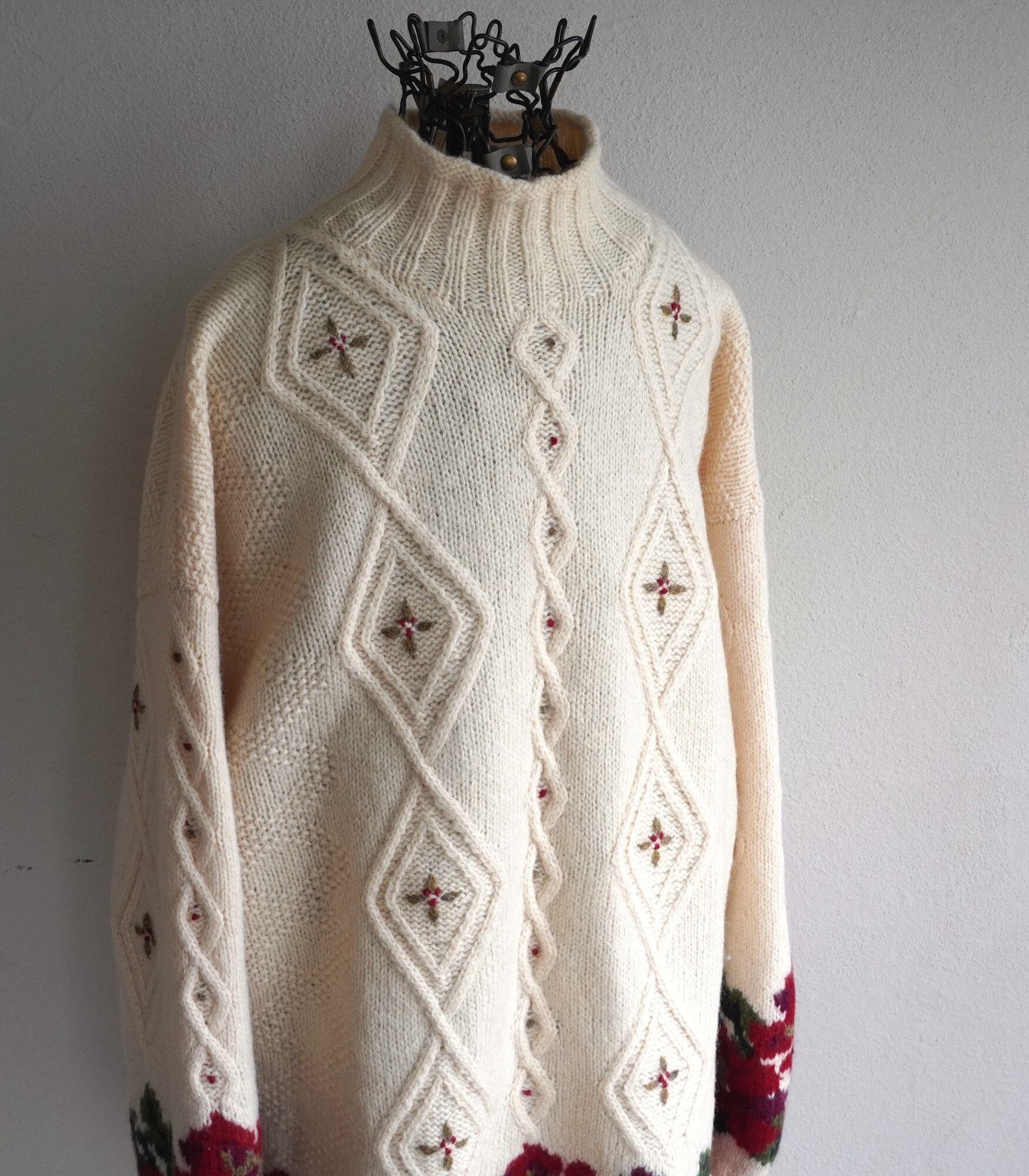 ダイヤモンドパターンのアラン編み×フローラル模様が可愛い、ウールニットセーター。