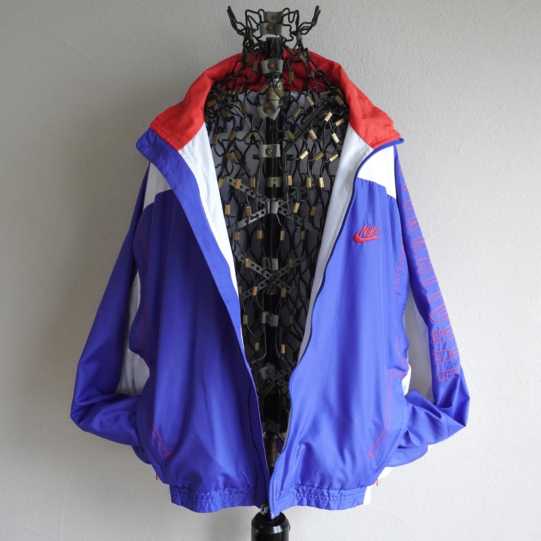 1990's [NIKE] "INTERNATIONAL" エンブロイダリー&パッチ トラックジャケット サルビア×ホワイト 表記(men's M) ウィンドブレーカー 白タグ ナイキ ヴィンテージ