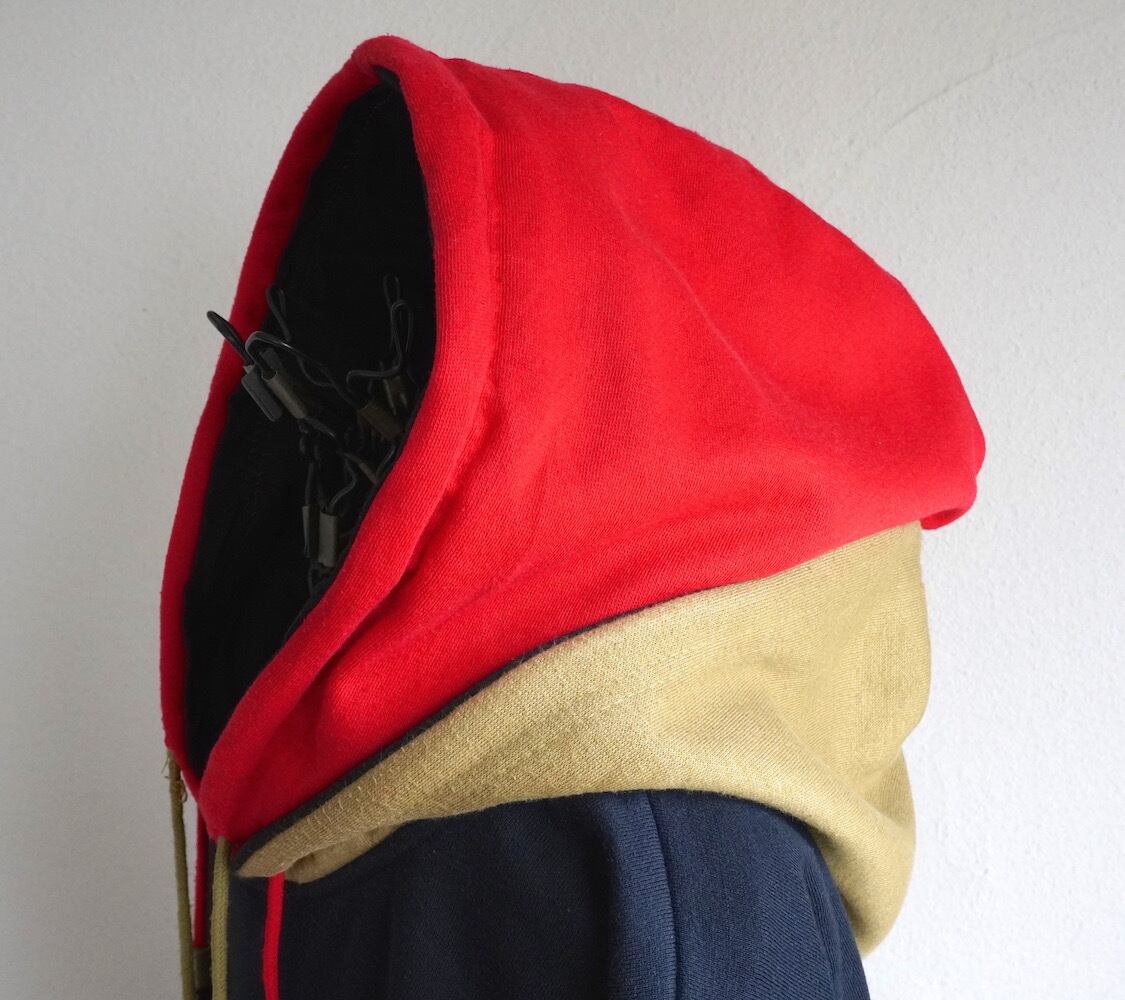 ダブル(2重)フードや、ビーズ付きのドローコードなど、凝ったデザイン。