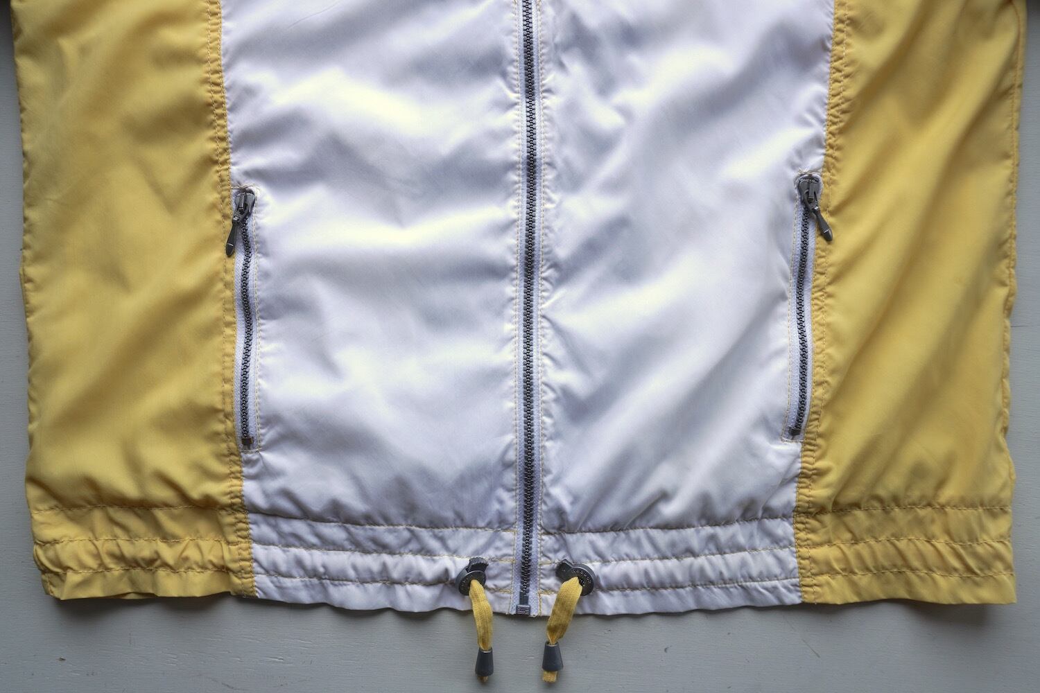 フロントにジップポケット、裾にドローコード、内側にはライニング付き。