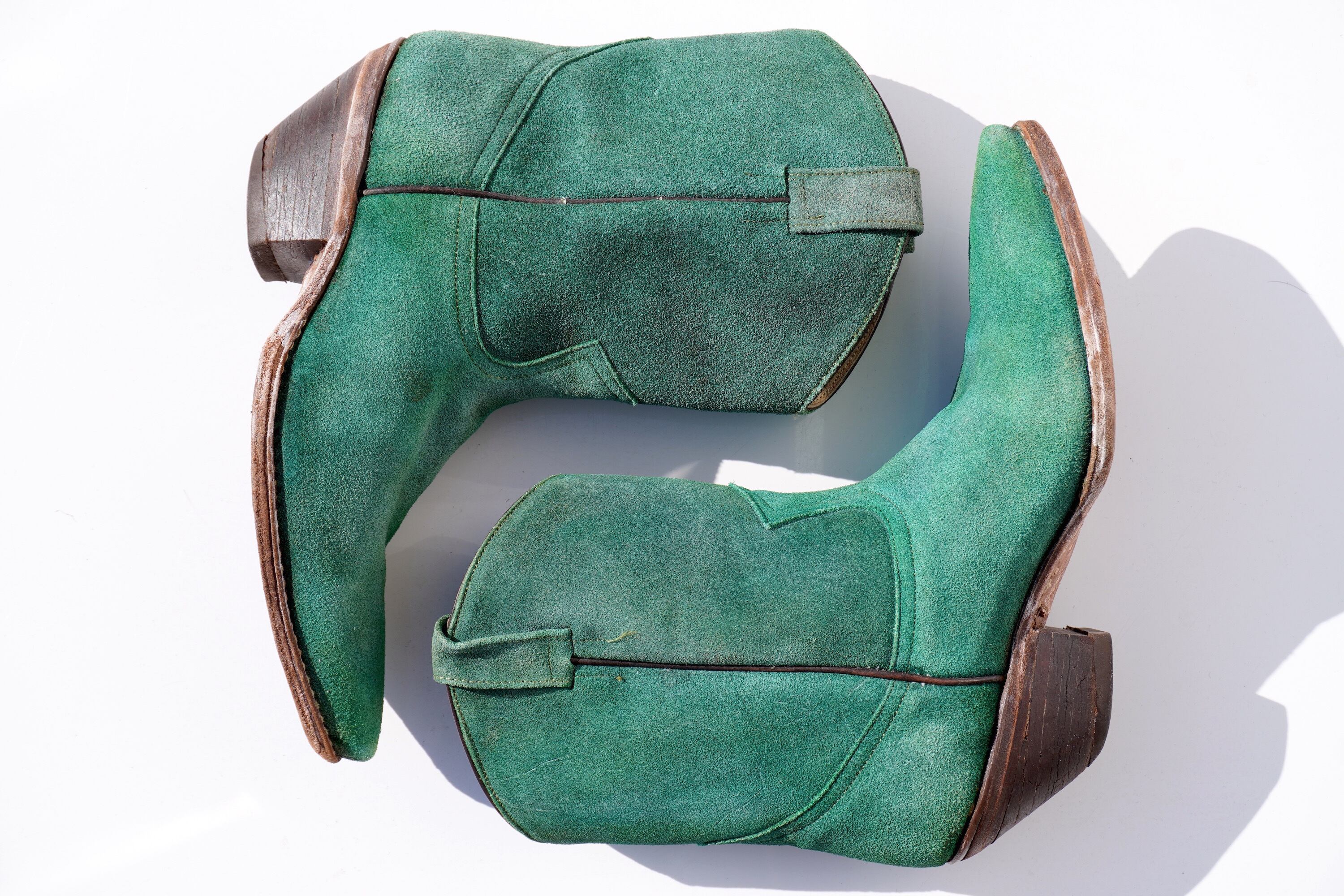 グリーンのスエードが目を惹く、ショート丈のウエスタンブーツ。