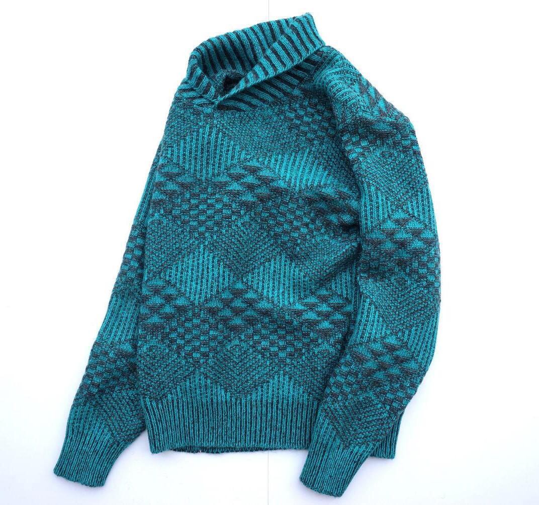 幾何学調のネイティブ柄が雰囲気の良い、ショールカラーニットセーター。